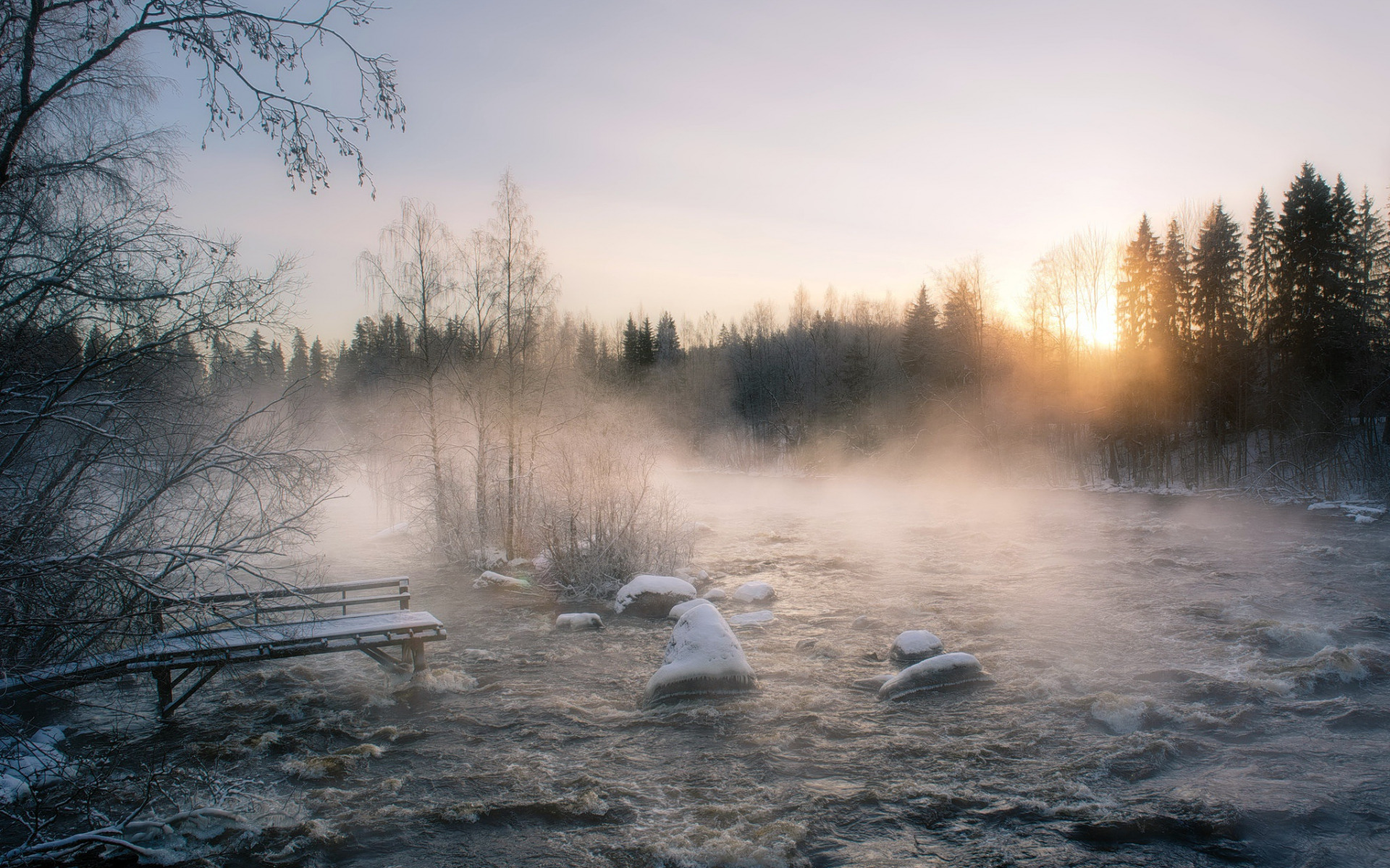 Description: A bench sitting in the middle of a river with fog in the air and trees in the background and a bench in the foreground.