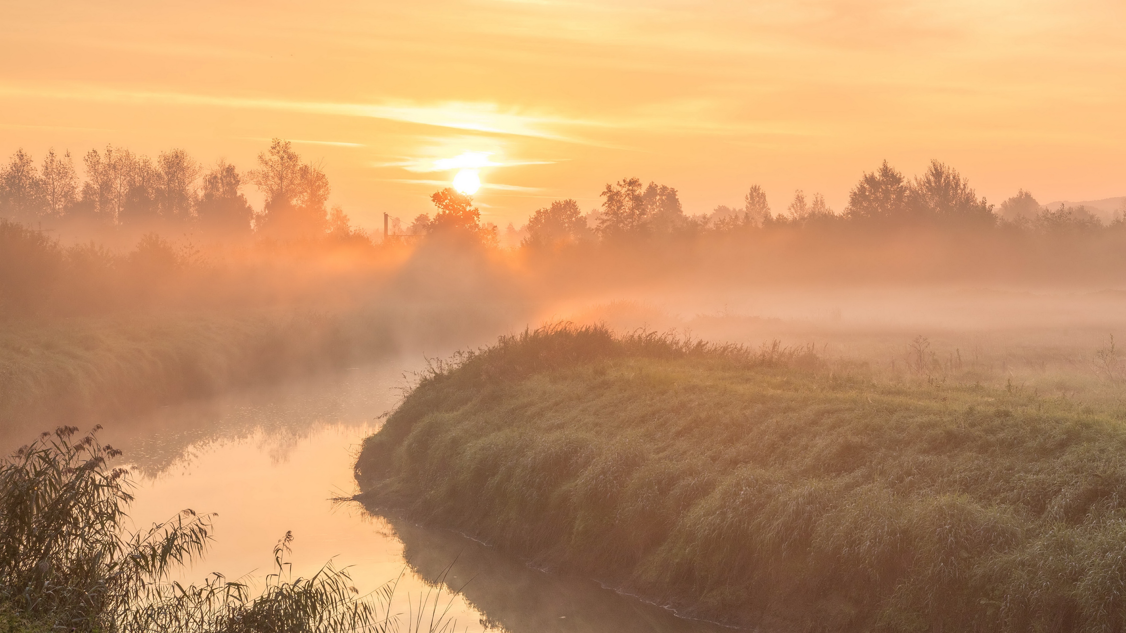 Description: A river with a few trees in the background and a foggy sky above it and a field with grass and bushes.