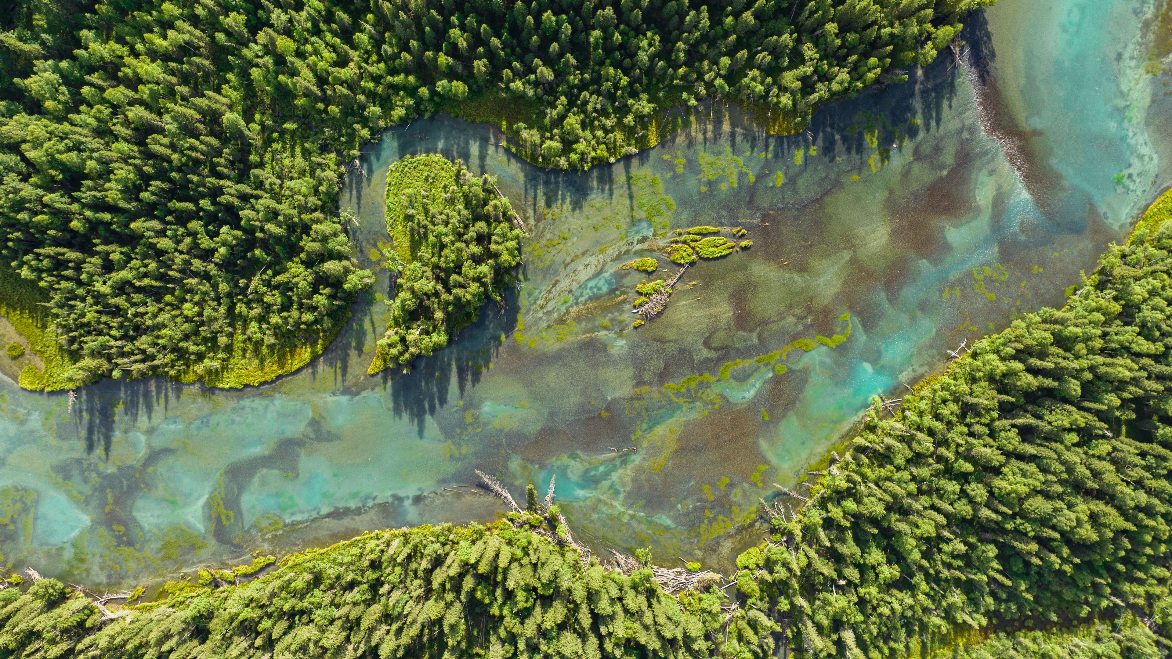 Description: A river running through a lush green forest covered in blue water and surrounded by trees and grass covered in algae.