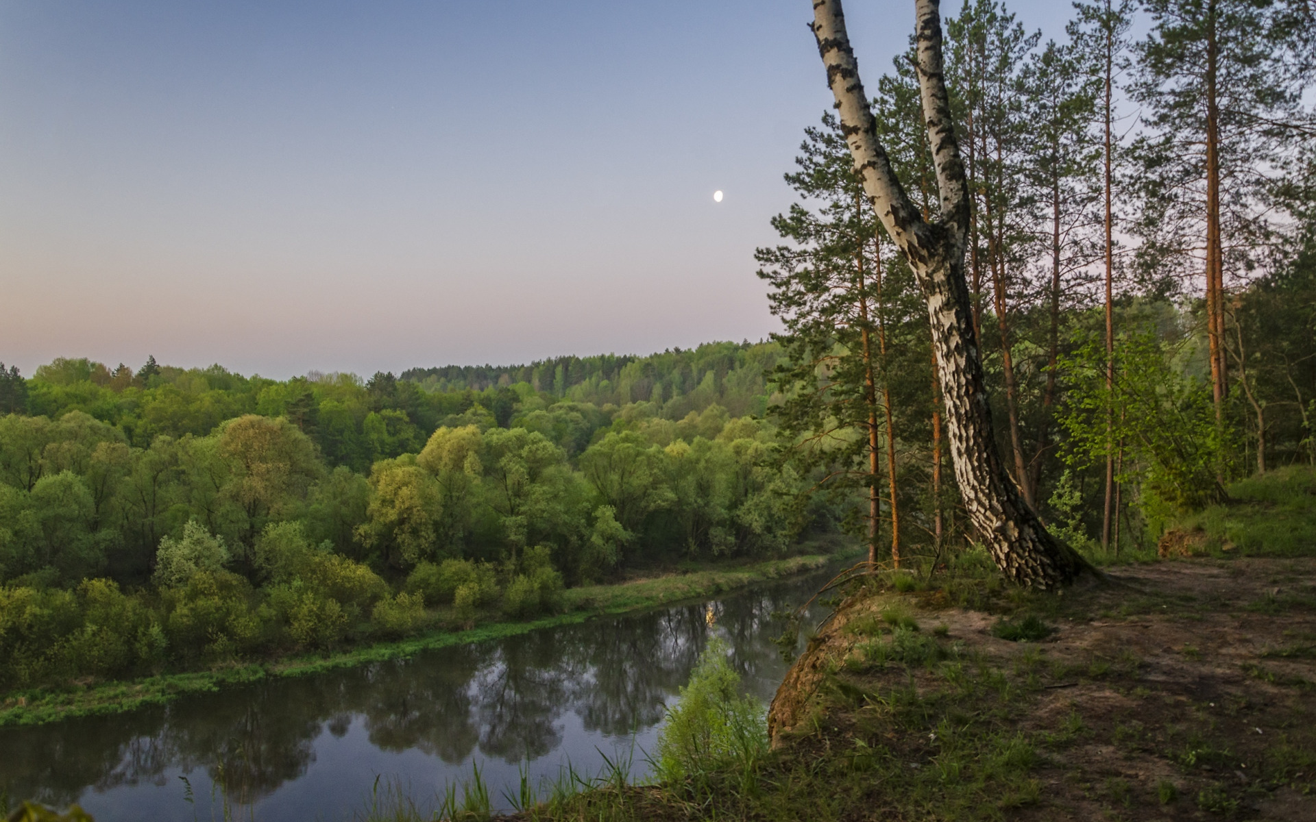 Description: A river running through a forest next to a forest covered in trees and grass at dusk with a half moon.