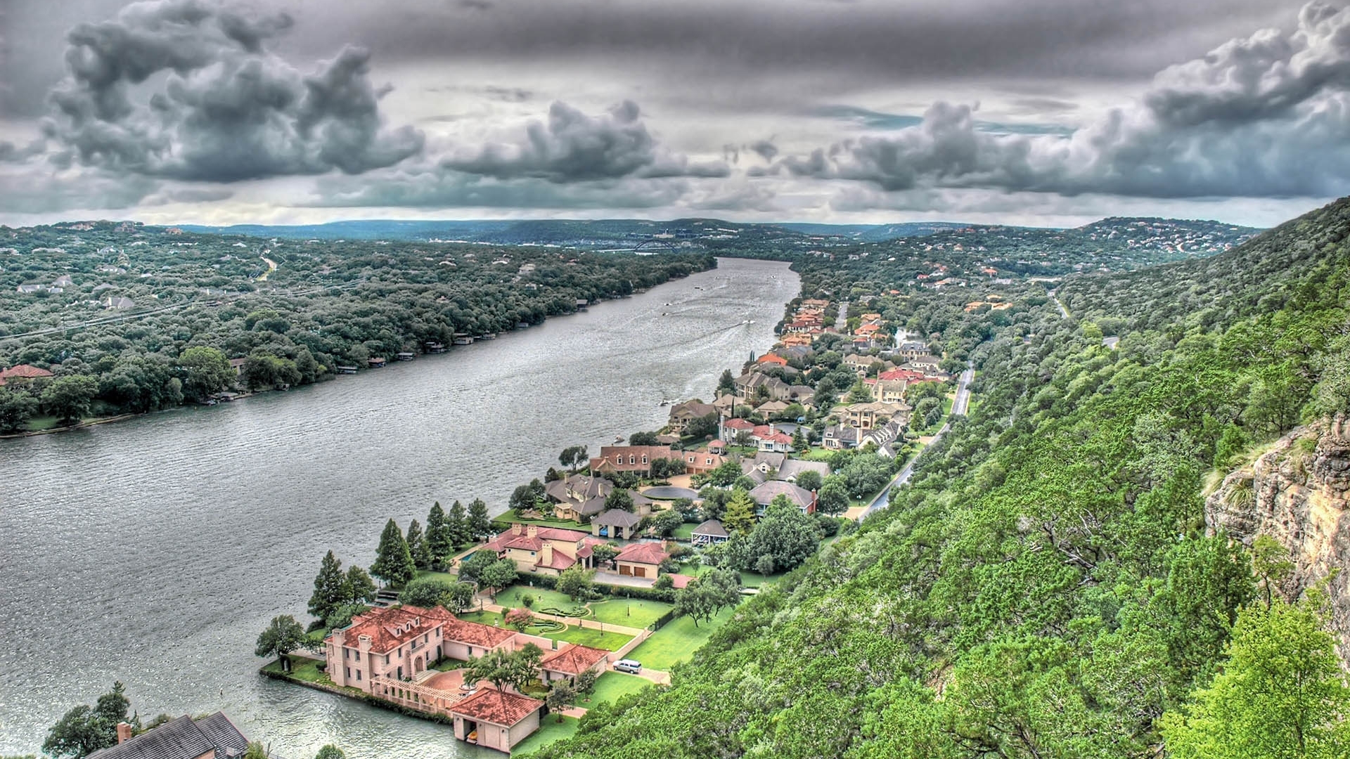 Description: A river running through a lush green hillside next to a lush green forest covered hillside under a cloudy sky.