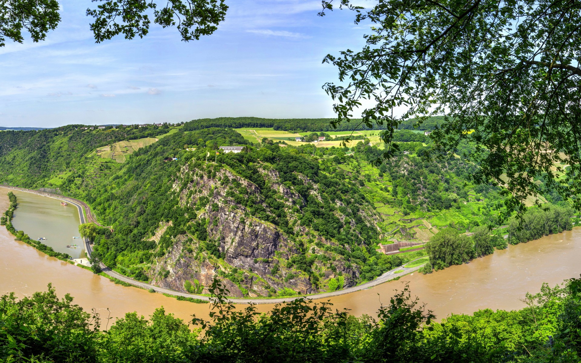 Description: A river flowing through a lush green forest covered hillside next to a lush green hillside covered in trees and grass.