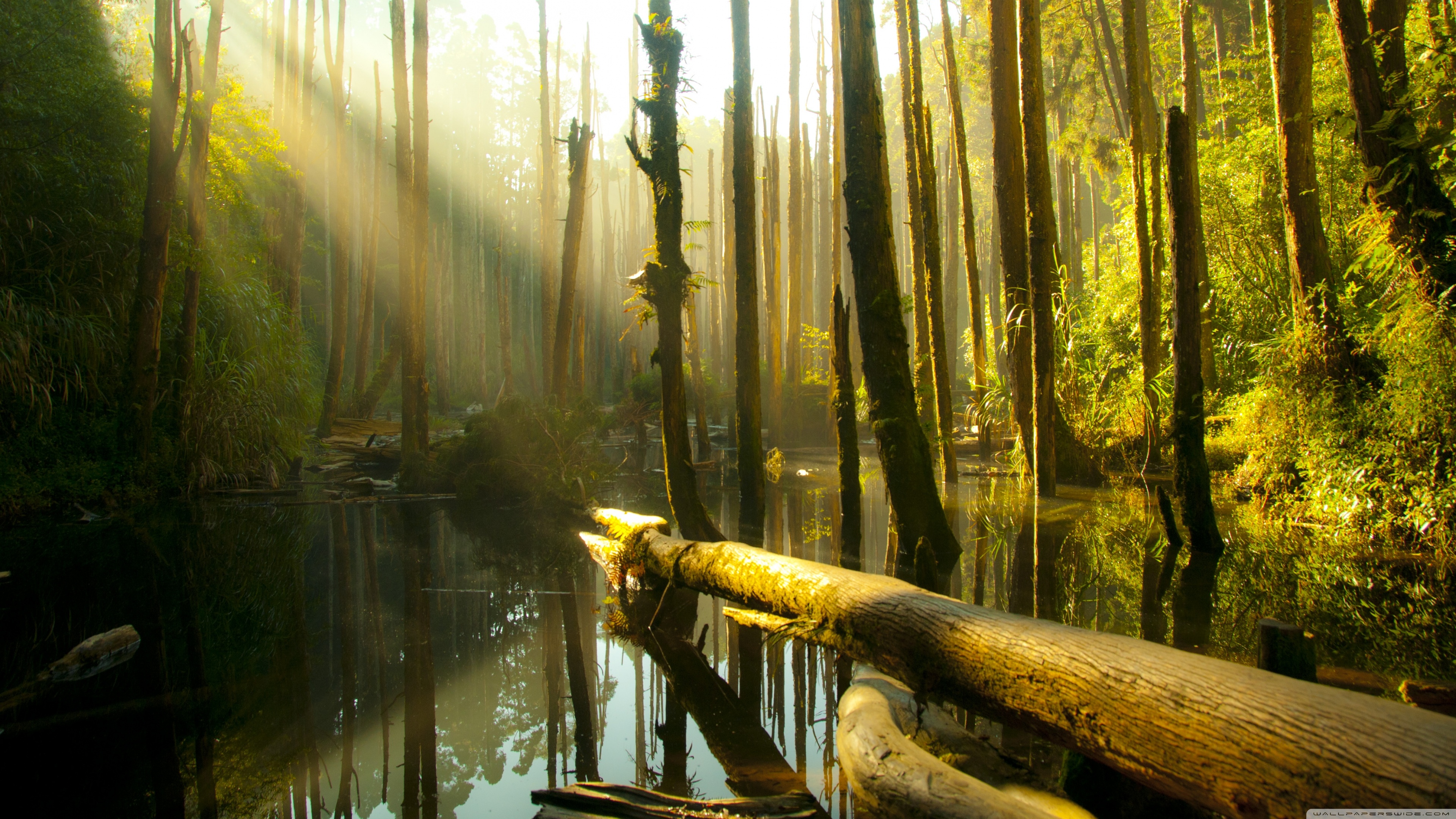 Description: A river in a forest with a log in the water and sun shining through the trees and the water.