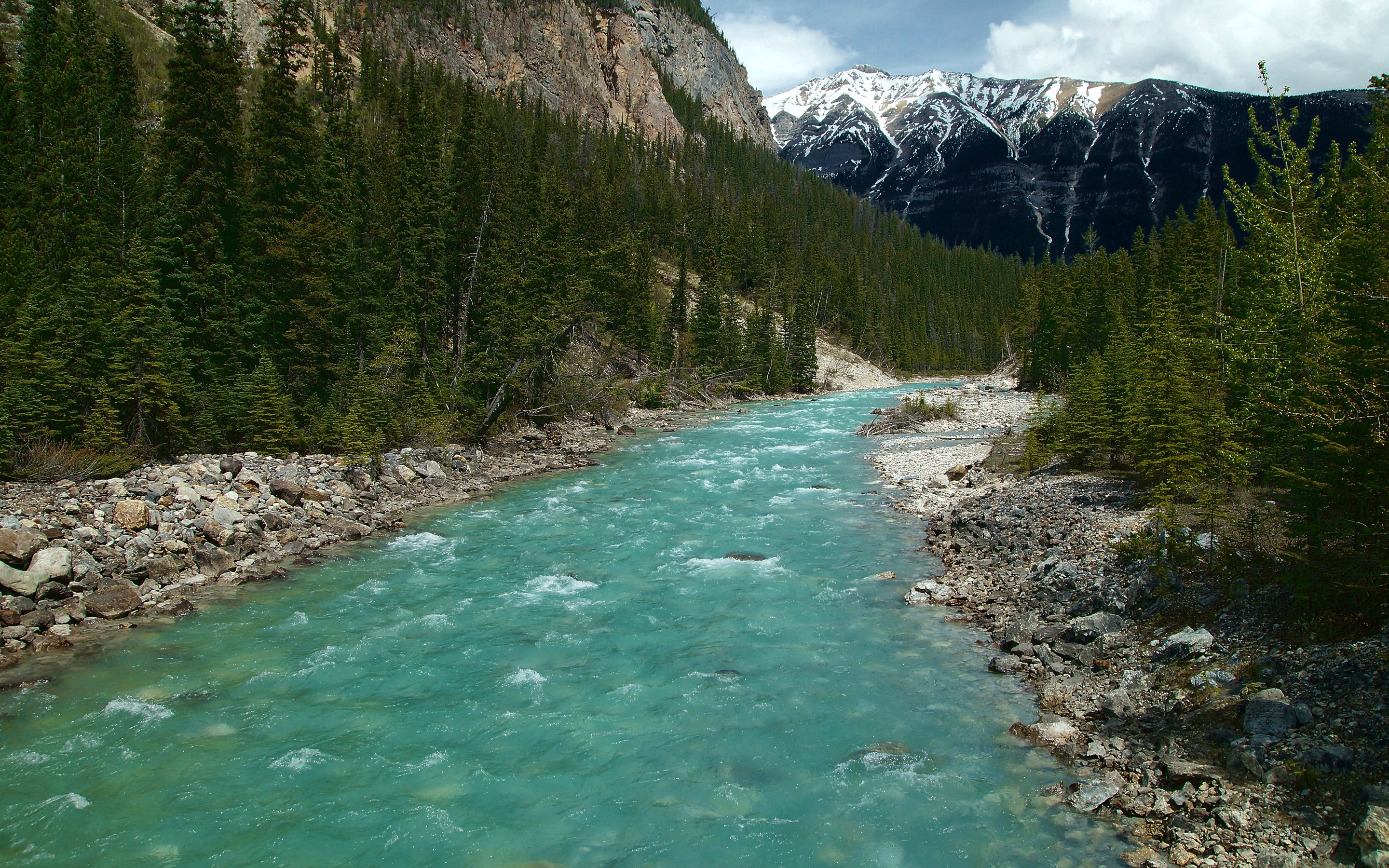 Description: A river running through a forest filled with trees and rocks next to a mountain range with snow on top.