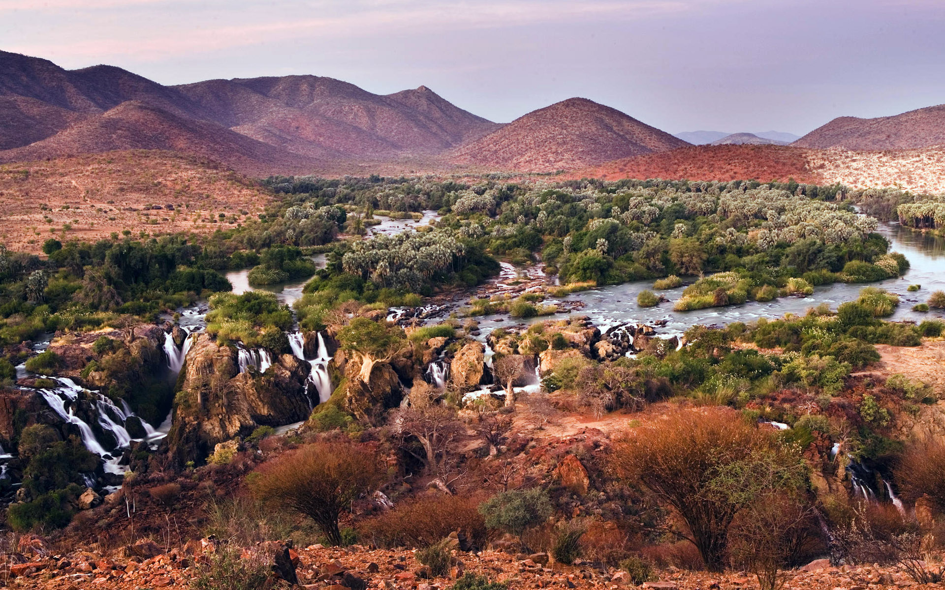 Description: A river running through a lush green forest filled with trees and bushes next to mountains in the distance with a pink sky.