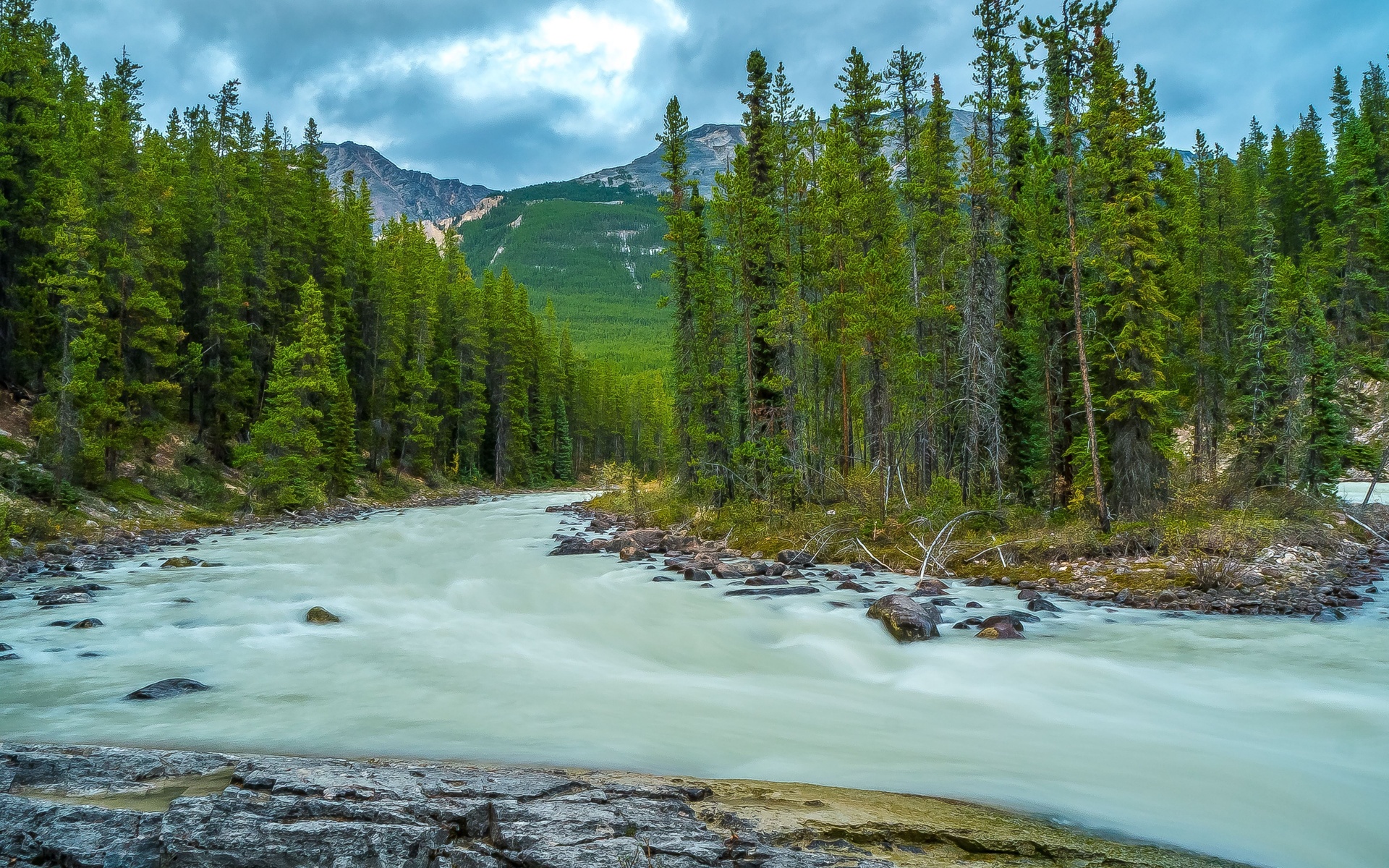 Description: A river running through a forest filled with trees and rocks in the middle of a forest filled with tall pine trees.