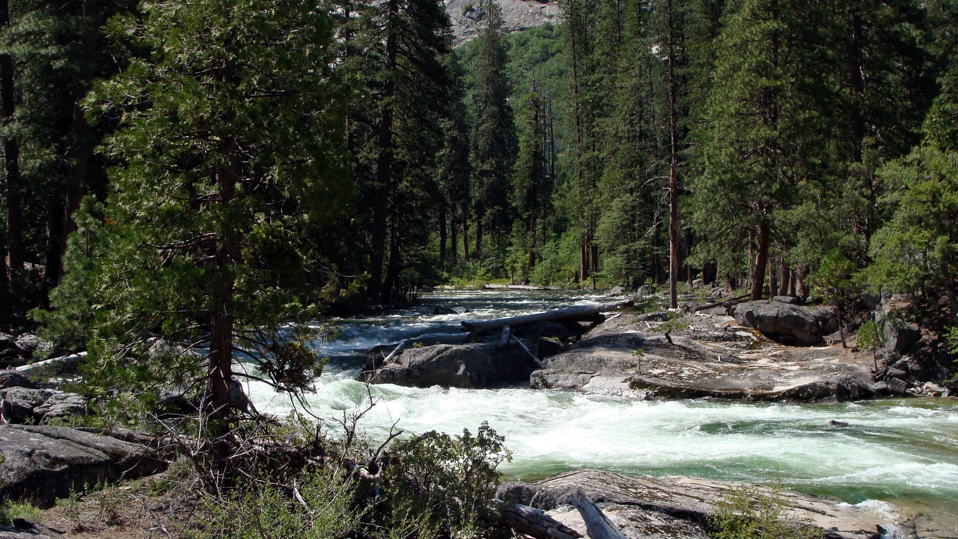 Description: A river running through a forest filled with trees and rocks and water running through it with rapids and rapids.