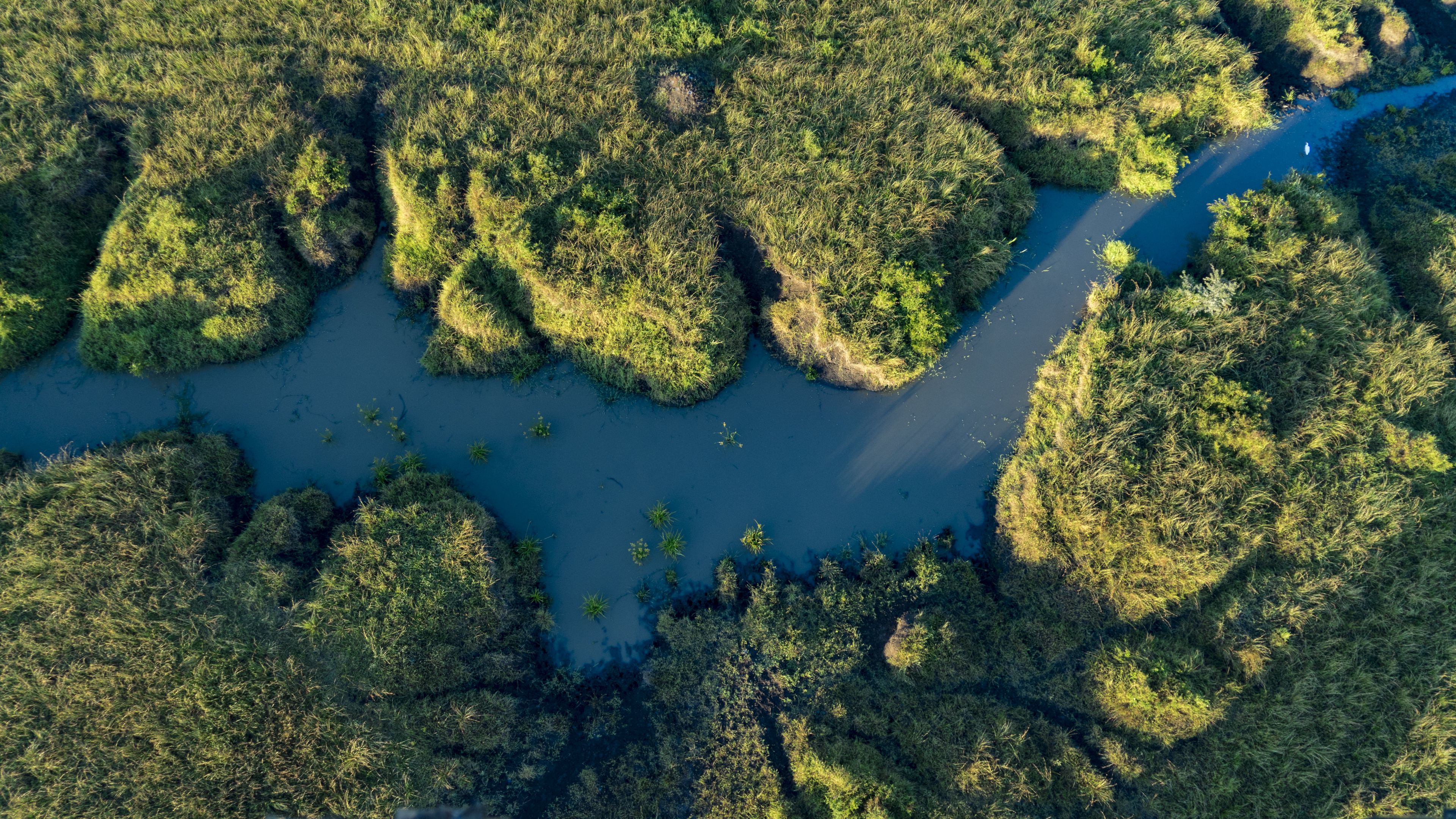 Description: A river running through a lush green forest covered in trees and grass.
