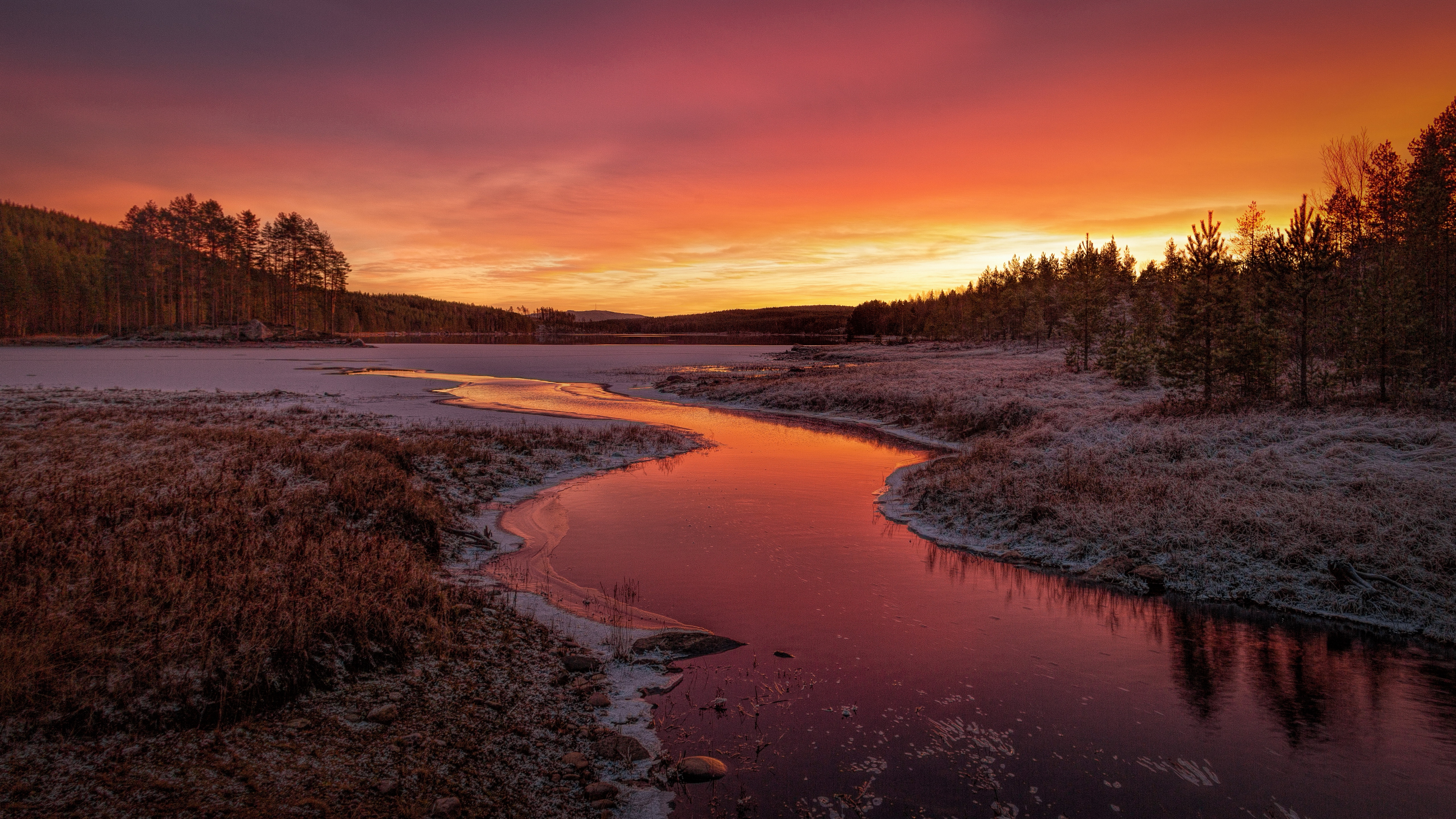 Description: A river running through a forest under a sunset sky with clouds above it and a few trees in the distance.