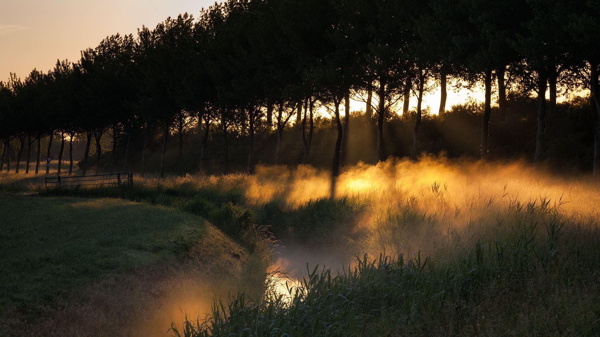 Description: A river running through a lush green forest under a sunset sky with fog and light coming from the trees.
