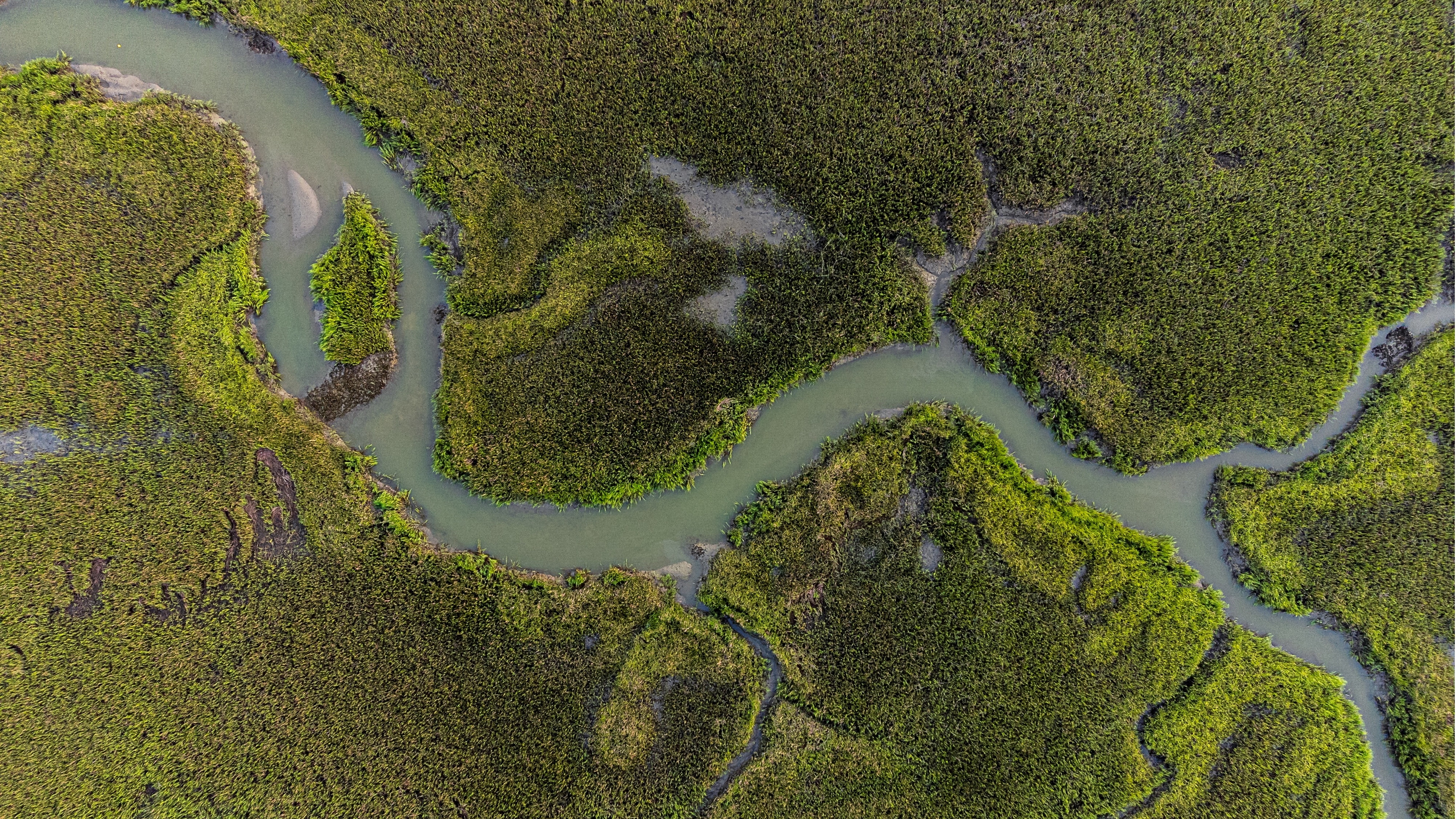 Description: A river running through a lush green forest covered in trees and grass.