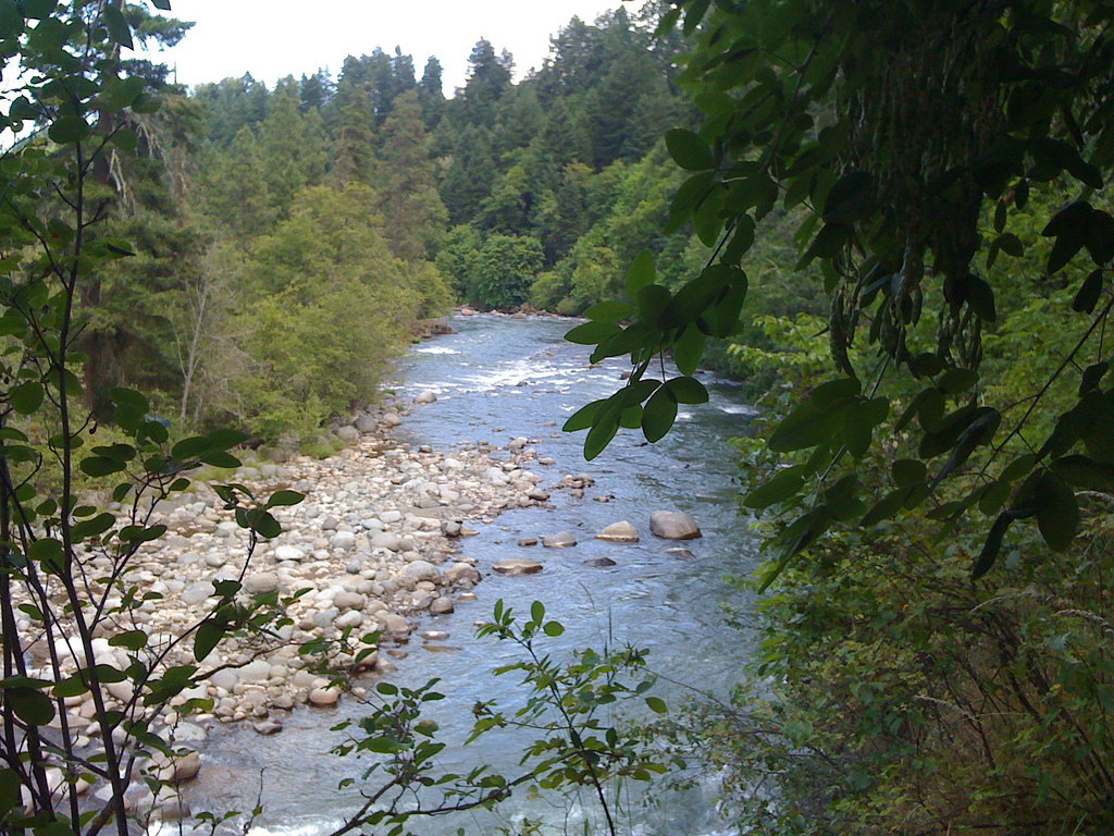 Description: A river running through a forest filled with lots of trees and rocks on the side of it's bank.
