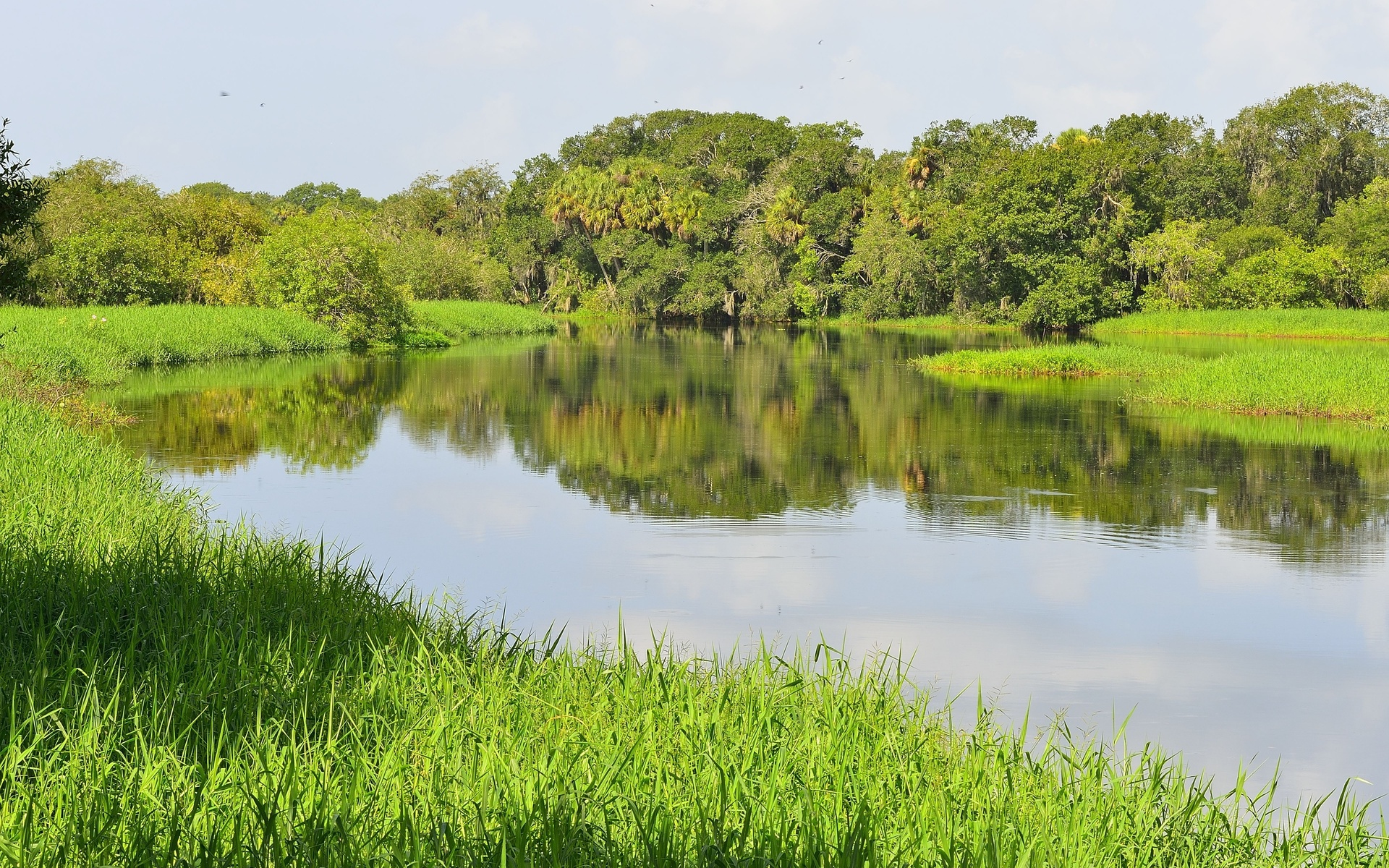 Description: A river with a grassy bank and trees in the background and a blue sky with clouds in the distance.