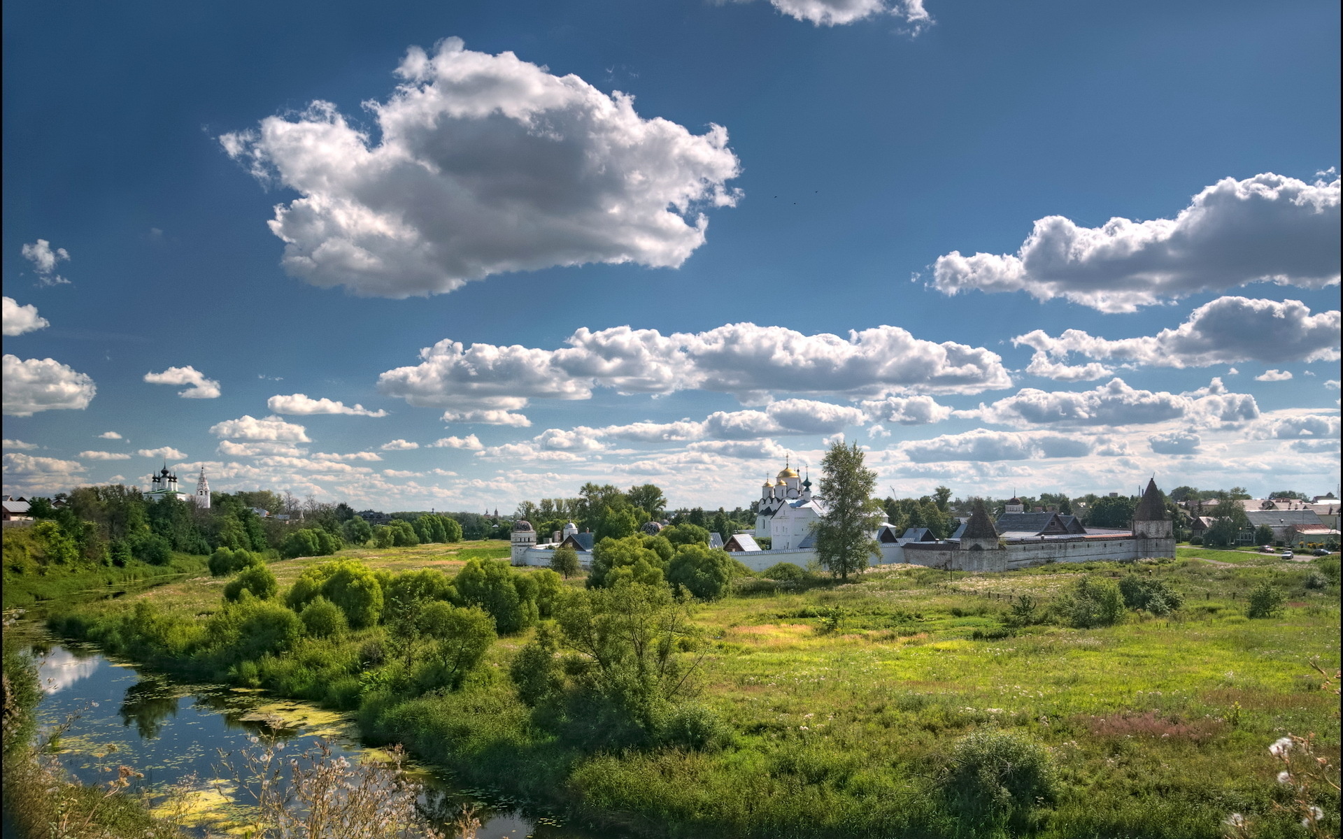 Description: A river running through a lush green countryside under a blue sky with clouds above it and a small town in the distance.
