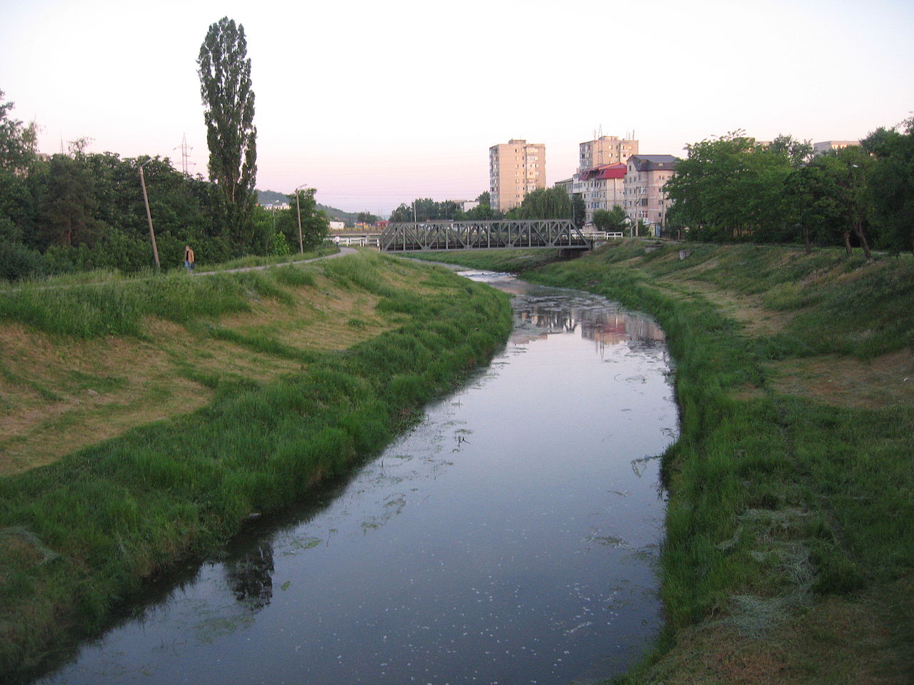 Description: A river running through a lush green countryside next to tall buildings and trees on a hill side with a bridge in the distance.