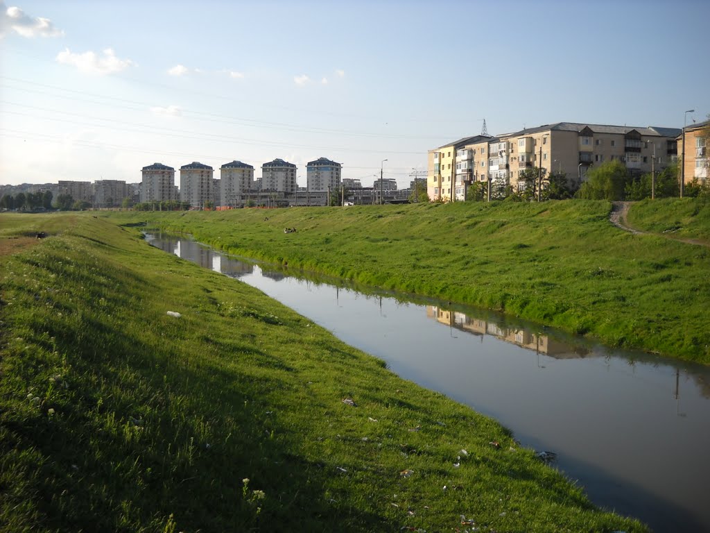 Description: A river running through a lush green field next to tall buildings and a lush green field with grass growing on both sides.