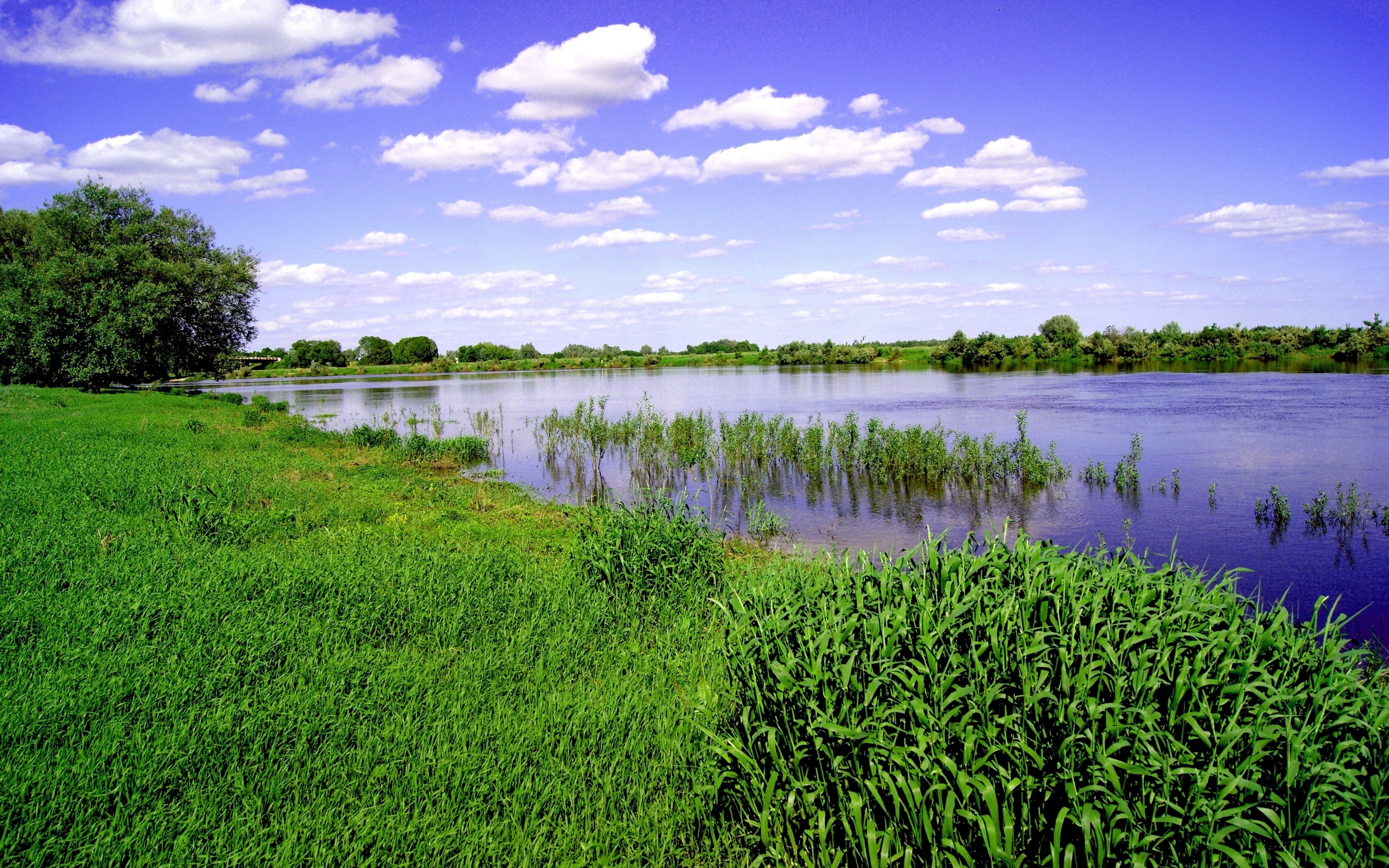 Description: A river with a grassy bank and a lush green field next to it and a blue sky with clouds.