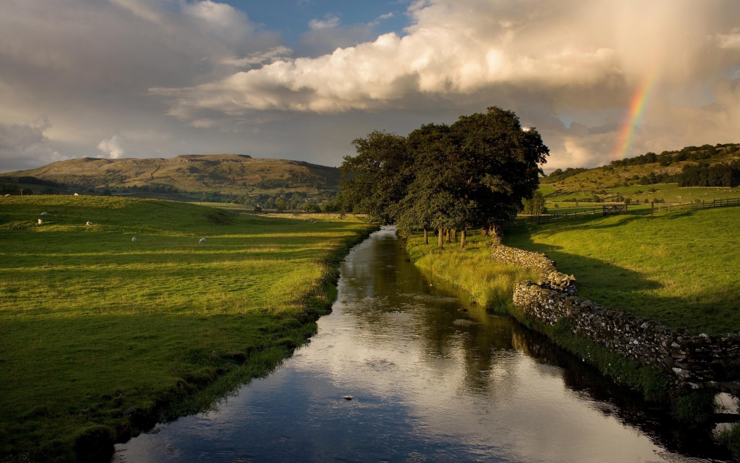 Description: A river running through a lush green field under a cloudy sky with a rainbow in the distance on a cloudy day.