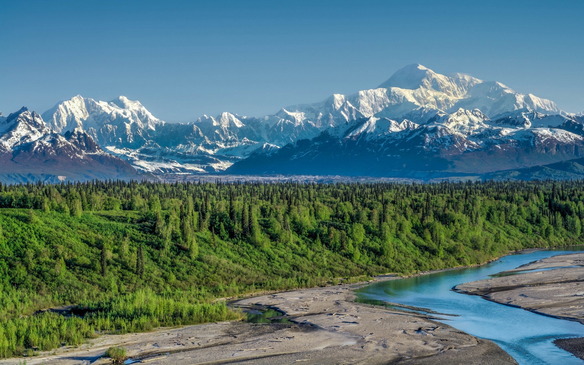 Description: A river running through a lush green forest covered hillside next to a mountain range with snow covered peaks in the distance.