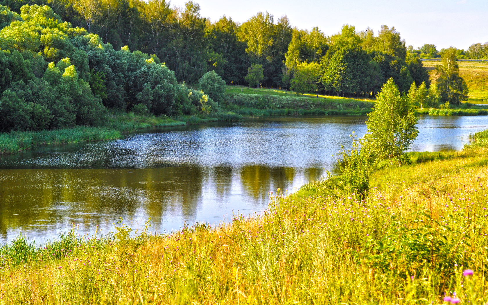 Description: A river surrounded by lush green trees and grass on a sunny day with a blue sky in the background.