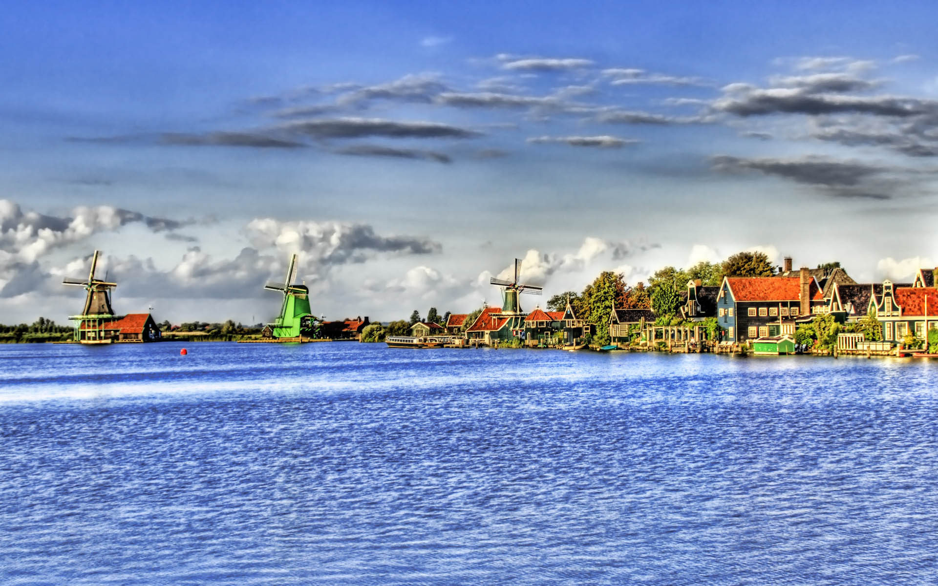 Description: A view of a river with a bunch of houses and windmills in the background and a cloudy sky.