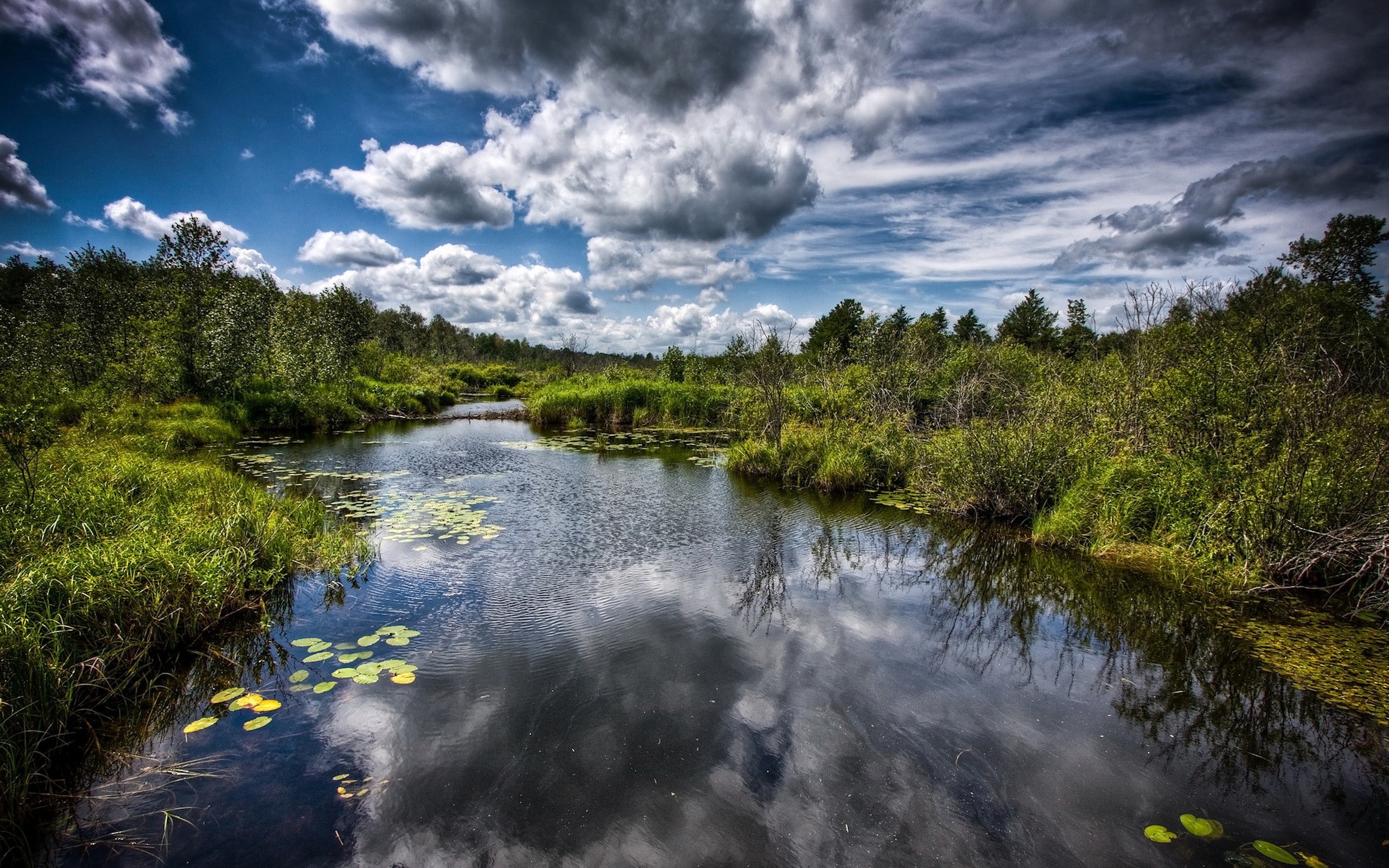 Description: A river surrounded by lush green trees and a cloudy sky above it is a swampy area with lily pads and water lilies.