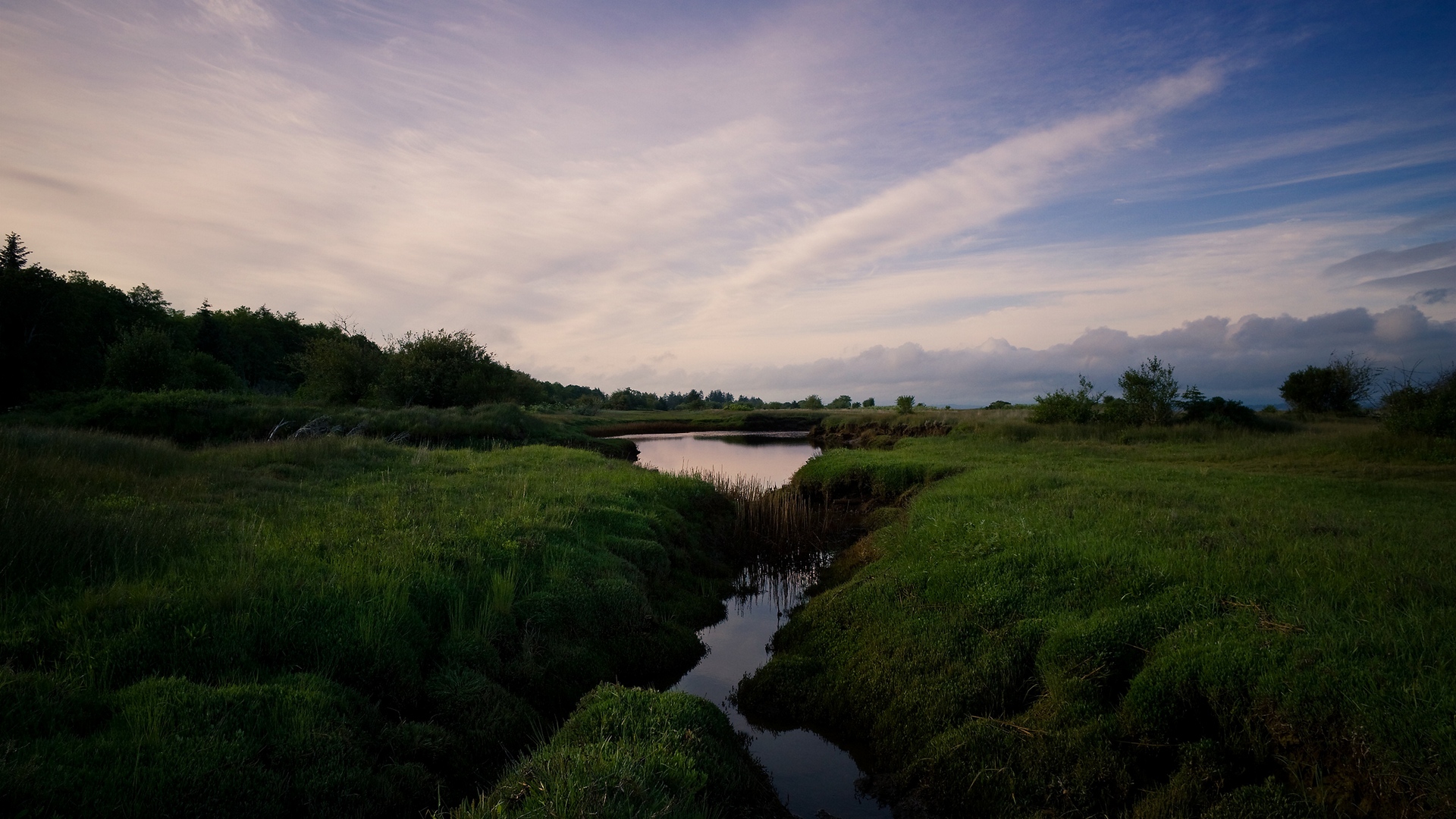 Description: A river running through a lush green field under a cloudy sky with clouds in the sky above it and a small pond in the middle.