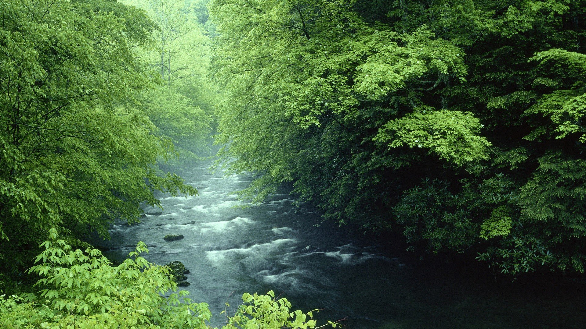 Description: A river running through a lush green forest filled with trees and bushes.
