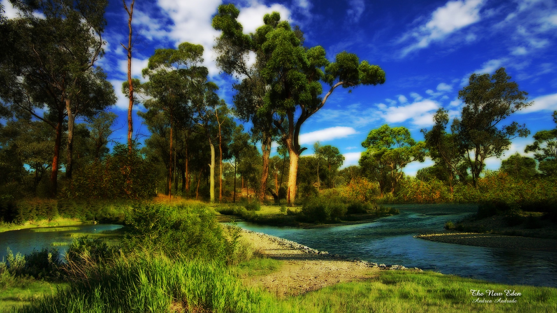 Description: A river running through a lush green forest filled with trees and grass on a sunny day with blue skies.