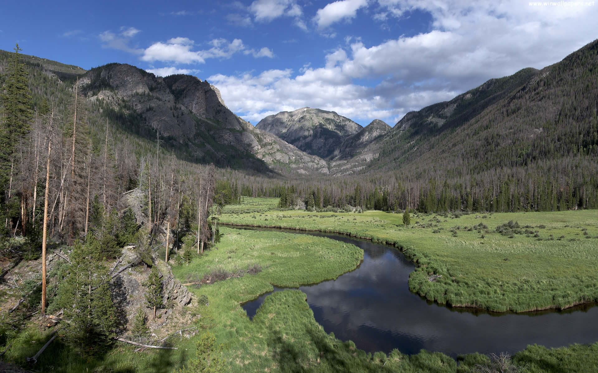 Description: A river running through a lush green forest filled with trees and mountains in the distance with a cloudy sky.