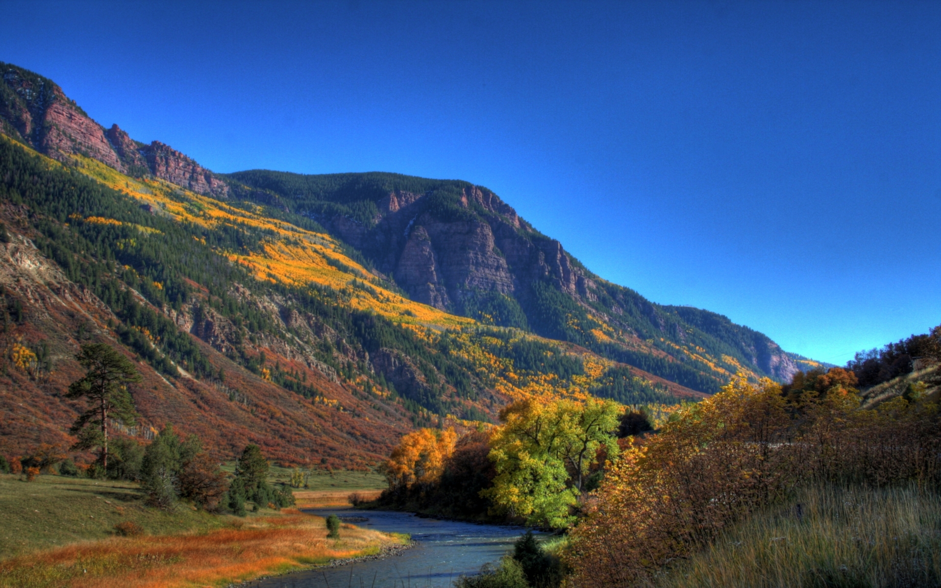Description: A river running through a lush green valley surrounded by mountains in autumn time with yellow and green foliage on the sides.