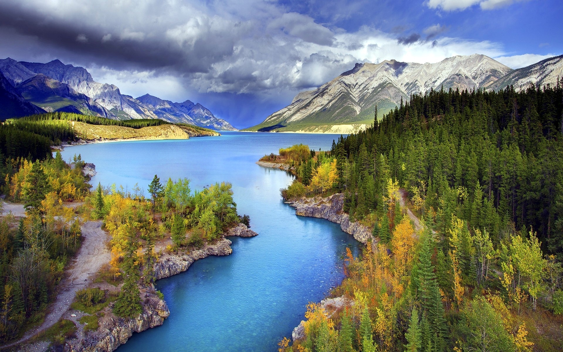 Description: A river surrounded by trees and mountains under a cloudy sky with clouds above it and a forest below it.
