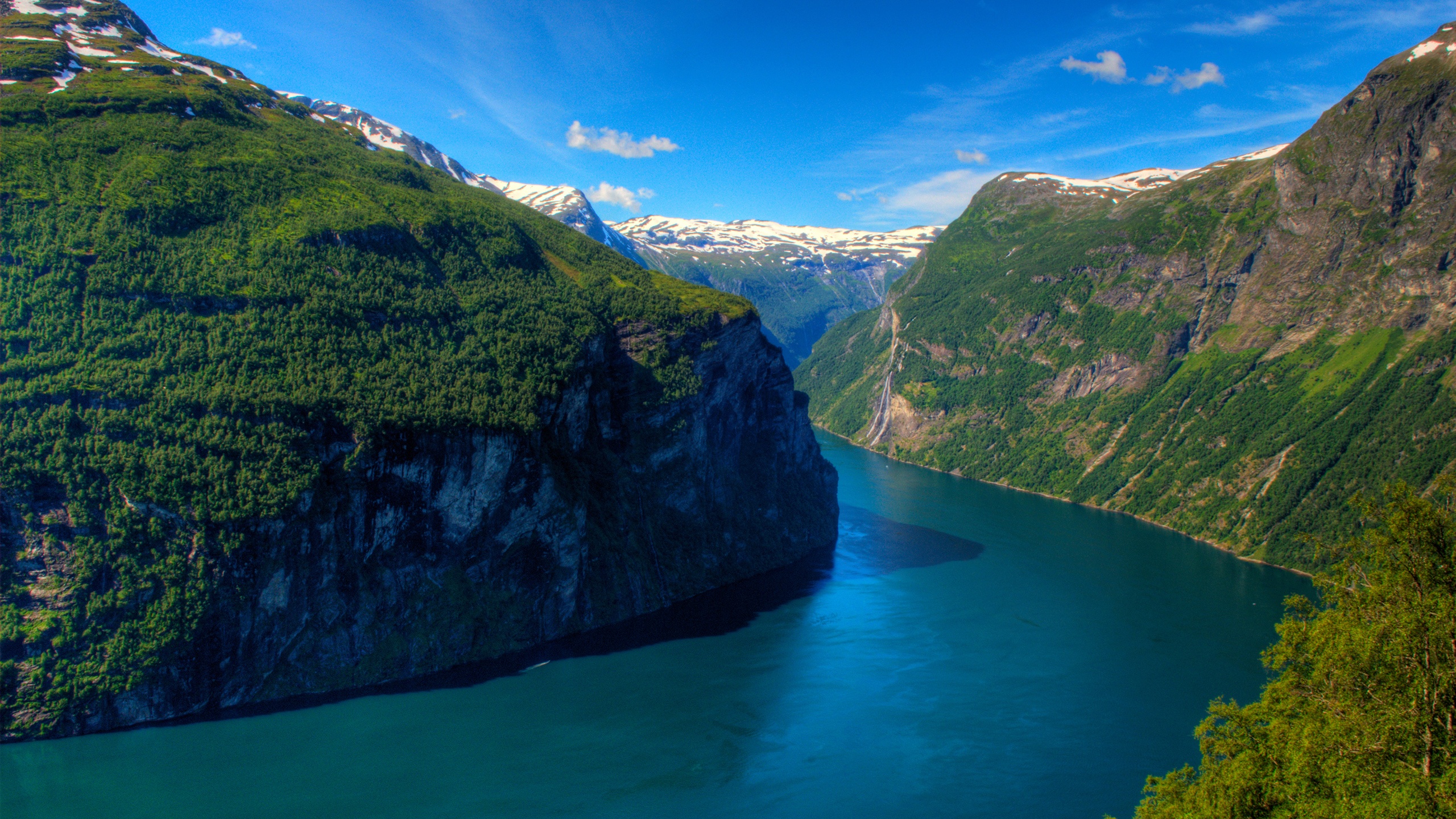 Description: A view of a river surrounded by mountains and trees in the foreground.