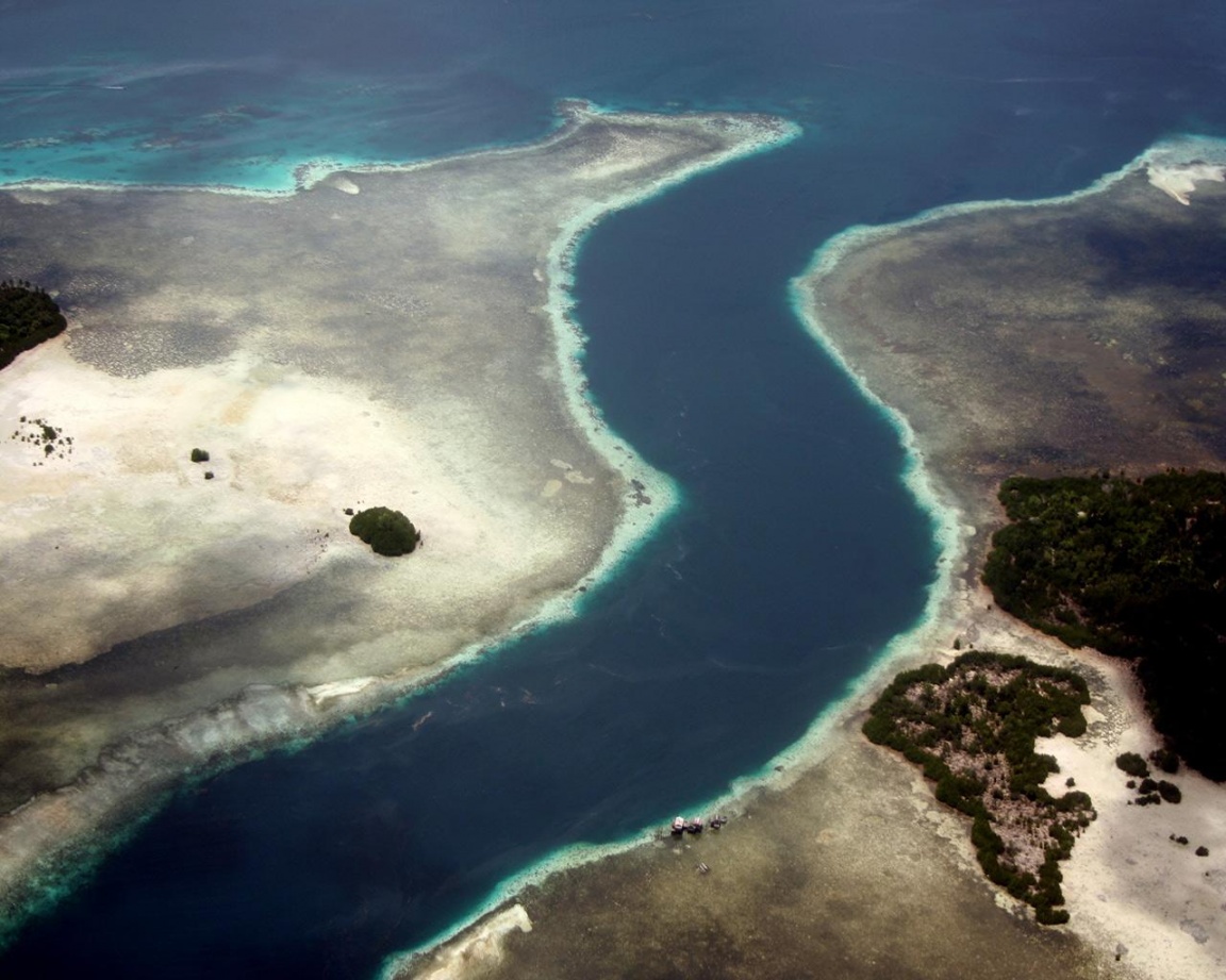 Description: A river running through a lush green ocean next to a forest of trees and landforms in the distance.