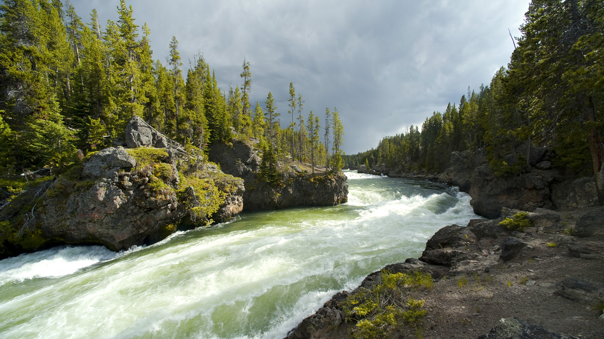 Description: A river with rapids and trees on the side of it and a cloudy sky above it and a few rocks and trees on the side of the river.
