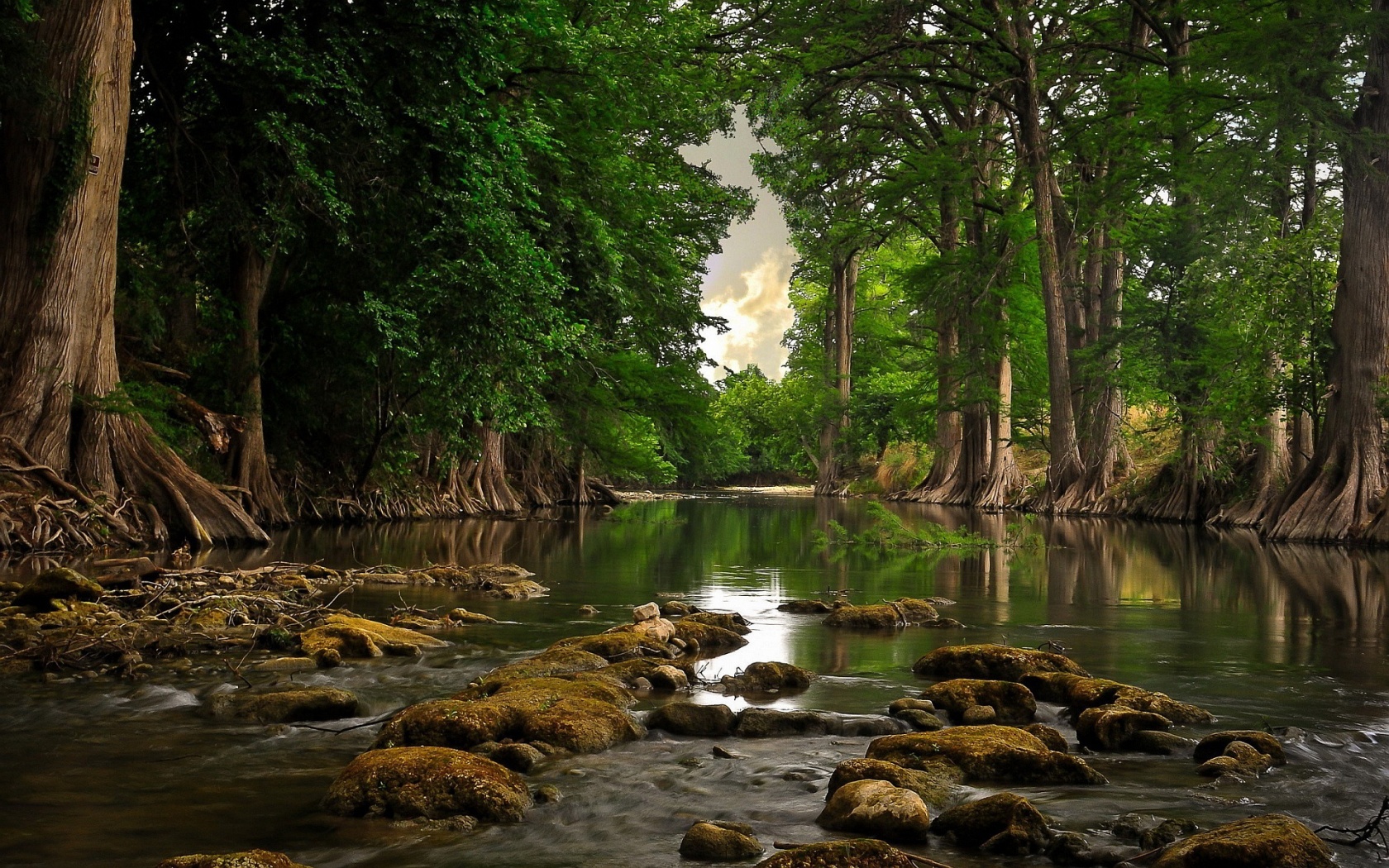 Description: A river with rocks and trees in the water and a cloudy sky above it and a few clouds in the sky.