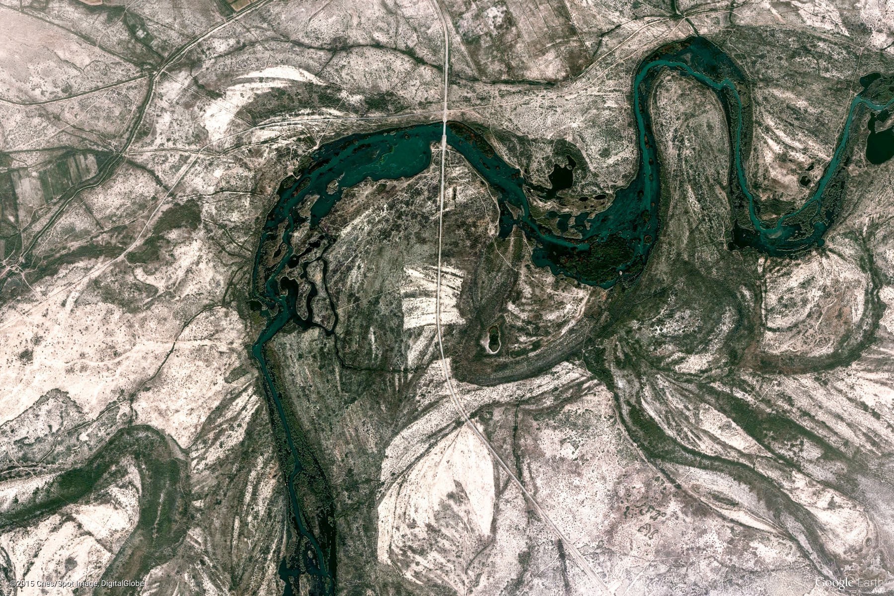 Description: A river is flowing through a rocky area with a green snake on it's side and a black snake on the other side.