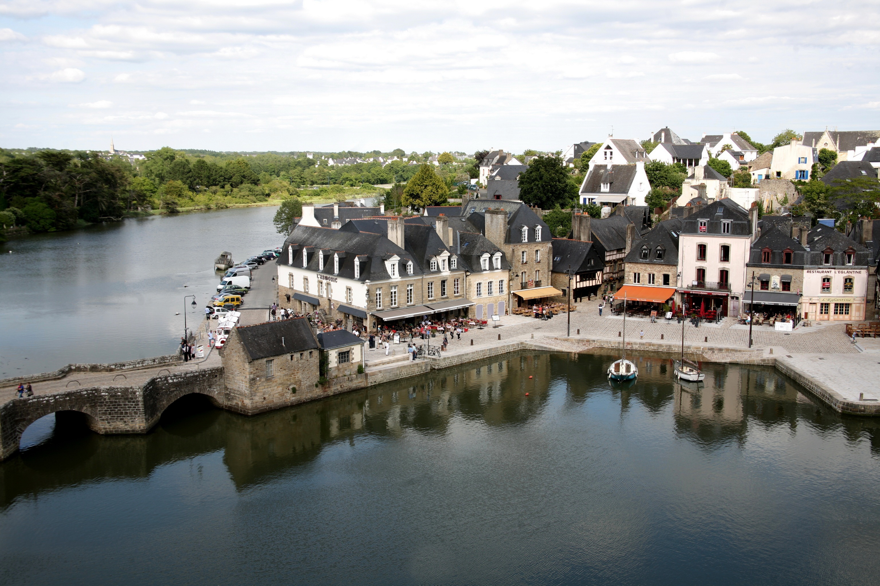 Description: A river running through a small town with a bridge over it and a bridge over the water leading to a town with a bridge.