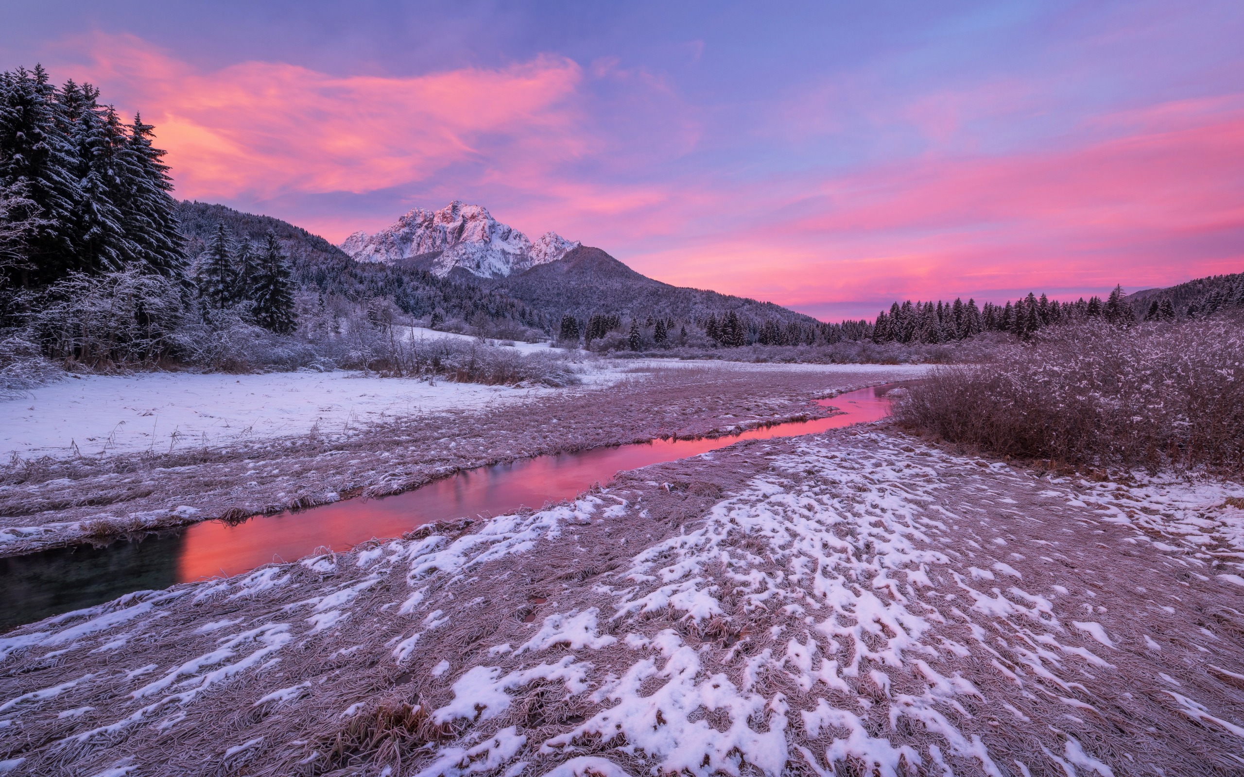 Description: A river running through a snow covered field next to a forest covered hillside with a pink sky in the background.