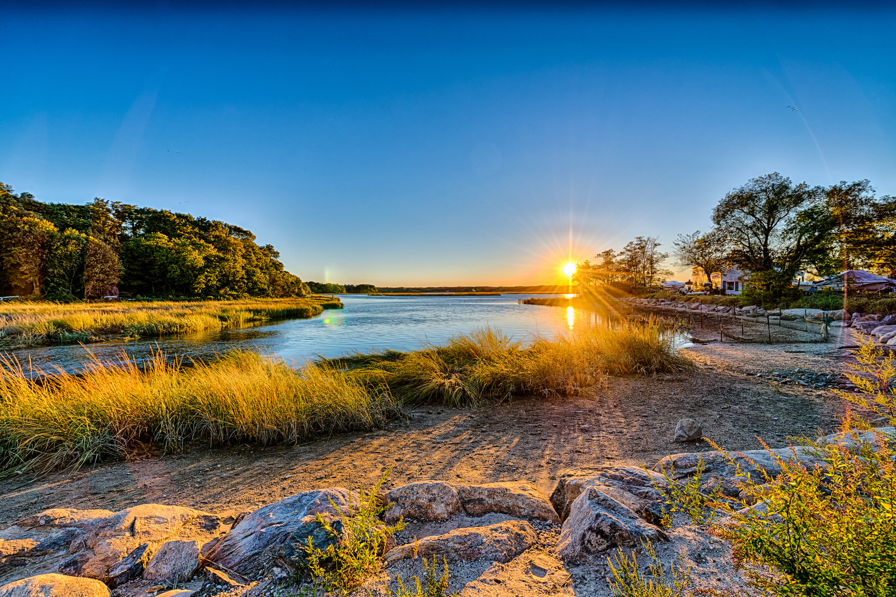 Description: A river with a sun setting in the distance and grass growing on the bank and rocks in the foreground.