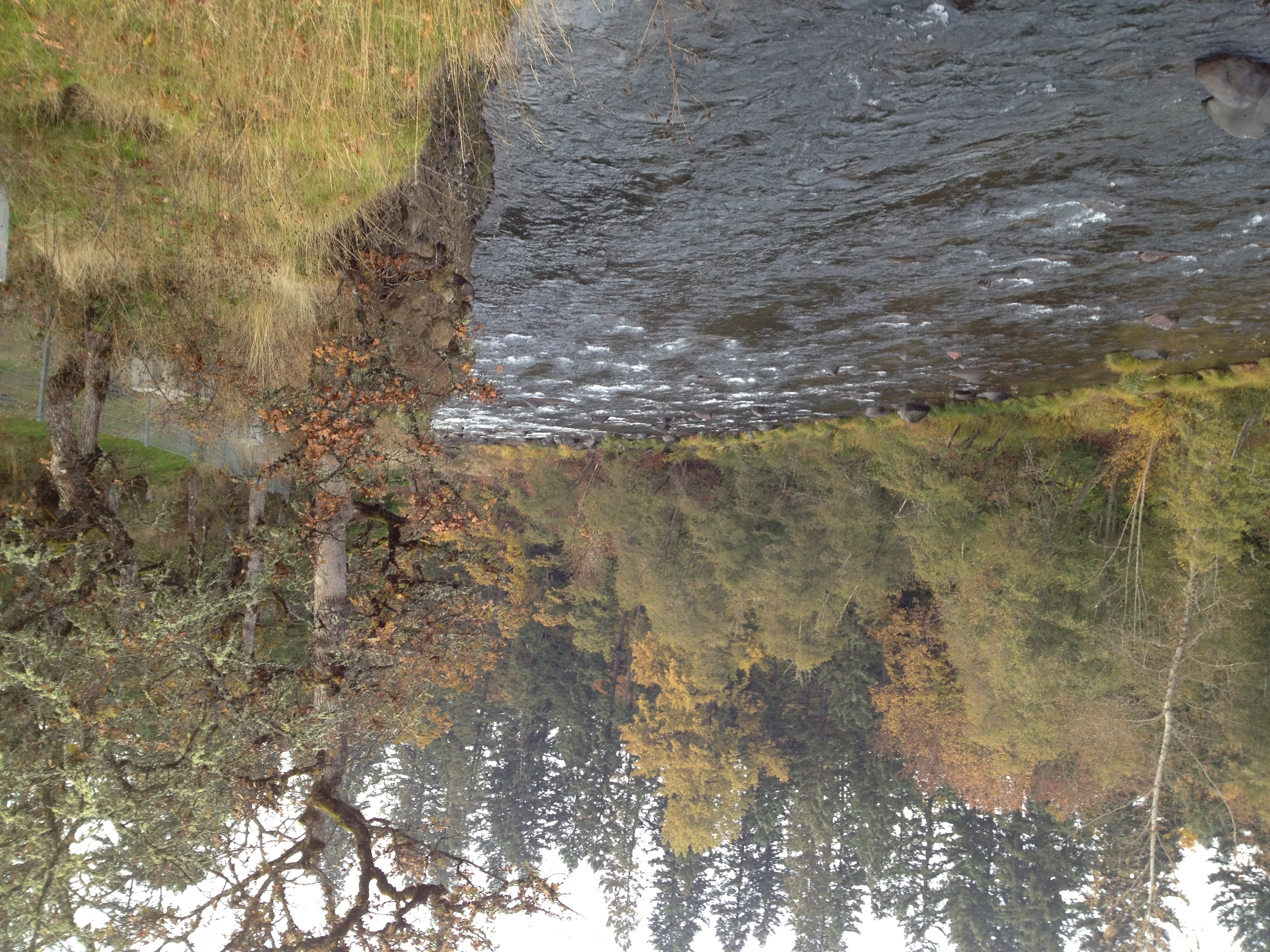 Description: A river with a few trees and a bird flying over it and a forest with a few trees and a bird flying over it.