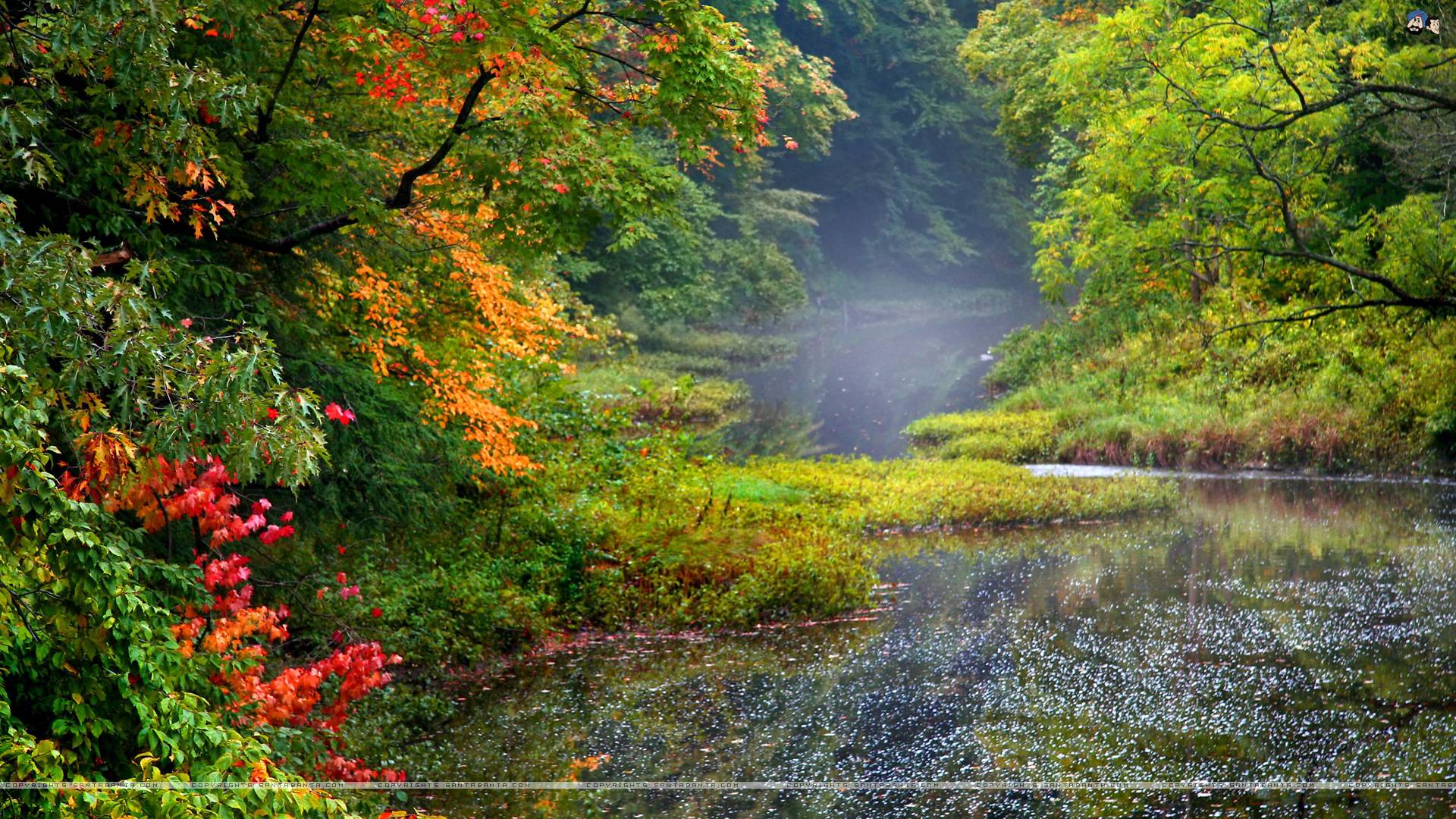 Description: A river surrounded by trees and foliage in the fall season with a foggy sky in the background and a stream running through the center.