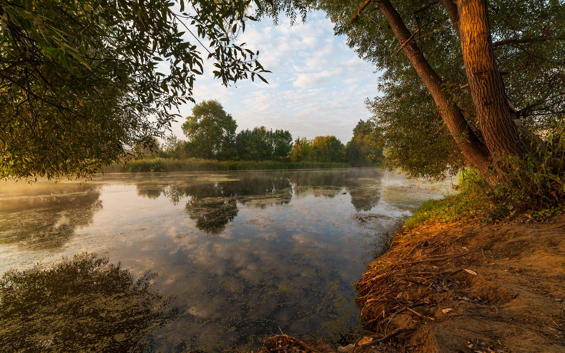 Description: A river with a few trees and water in it and a sky with clouds above it and a few clouds in the sky.