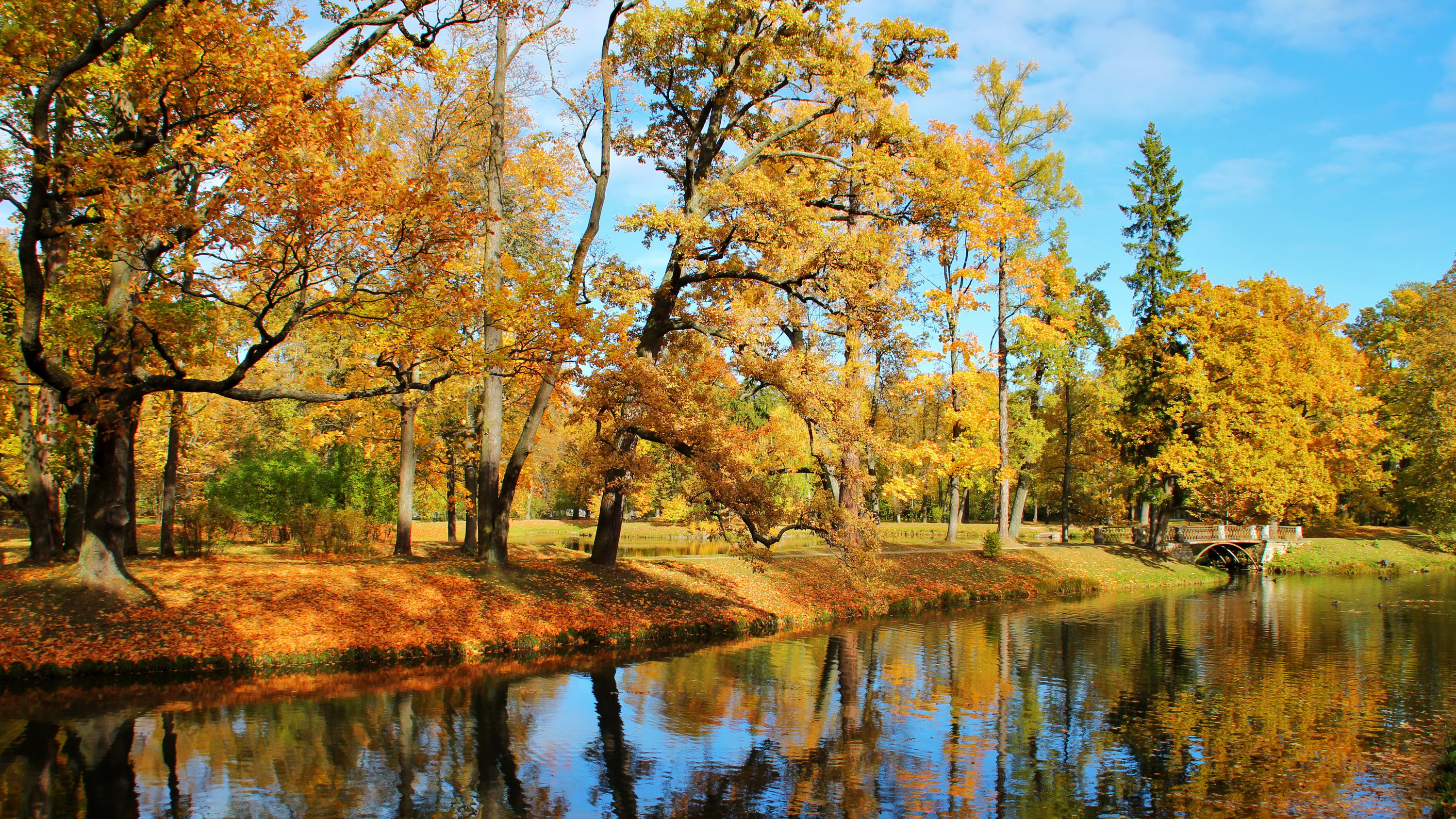 Description: A river surrounded by trees with yellow leaves on it and a bridge in the distance with a blue sky.