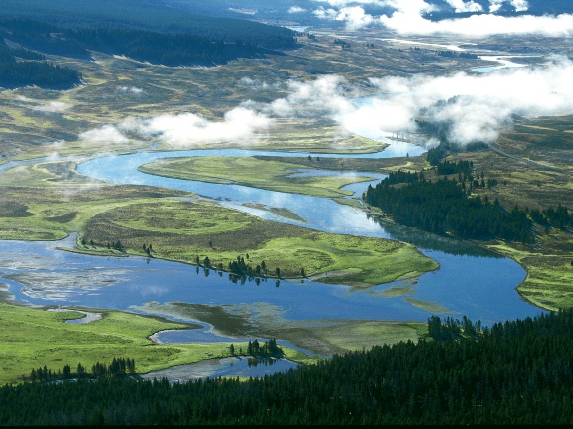 Description: A river running through a lush green valley surrounded by forest covered mountains and clouds in the sky above it.