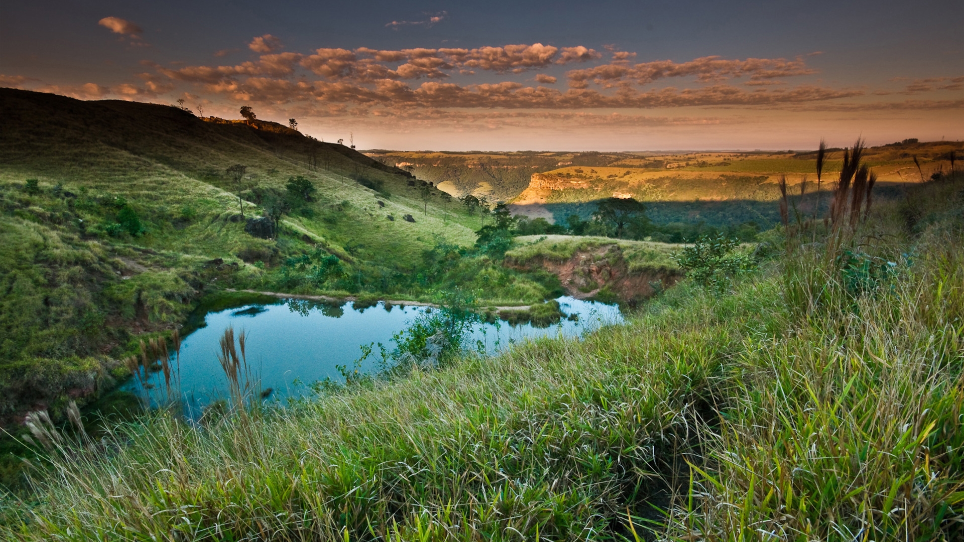 Description: A beautiful view of a river in a valley with a grassy hillside in the background and a cloudy sky.