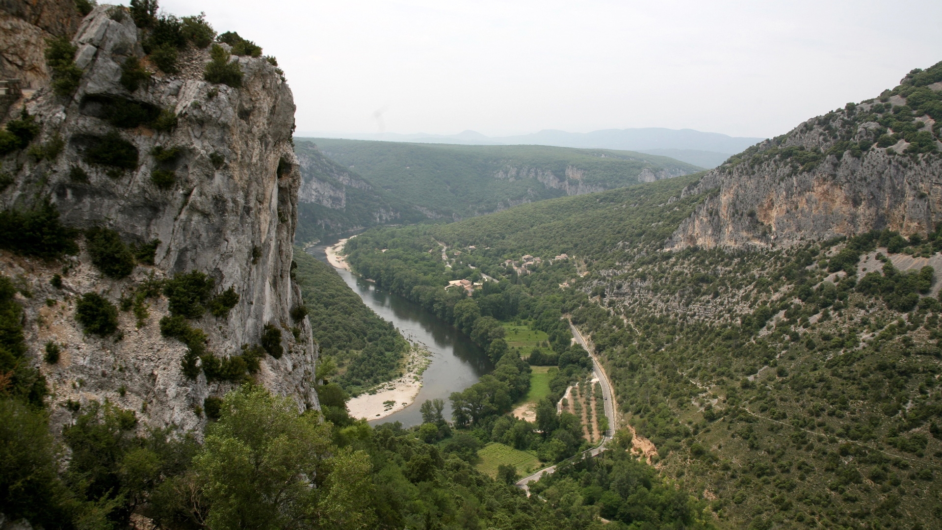 Description: A river running through a valley surrounded by mountains and trees on a cloudy day with a sky background and a few clouds.