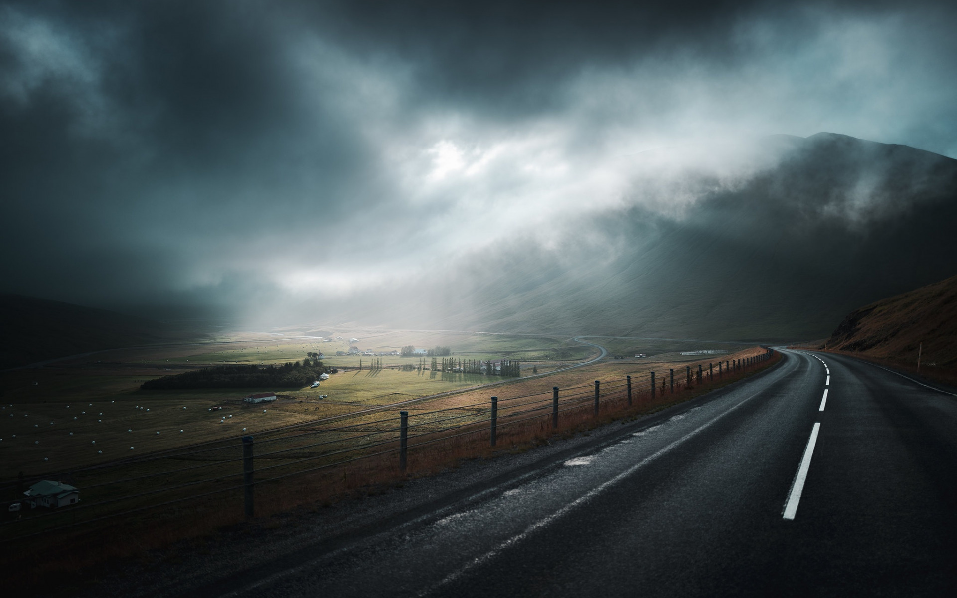 Description: A road with a fence and a field with sheep on it under a cloudy sky with a mountain in the distance.