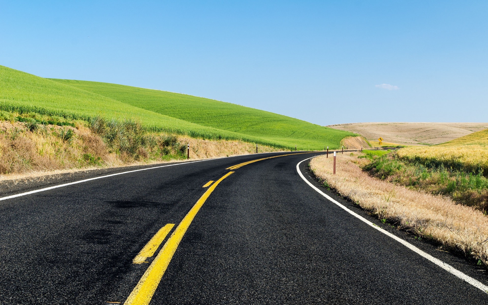 Description: A road with a yellow line going through a green field of grass and a hill in the background with a blue sky.