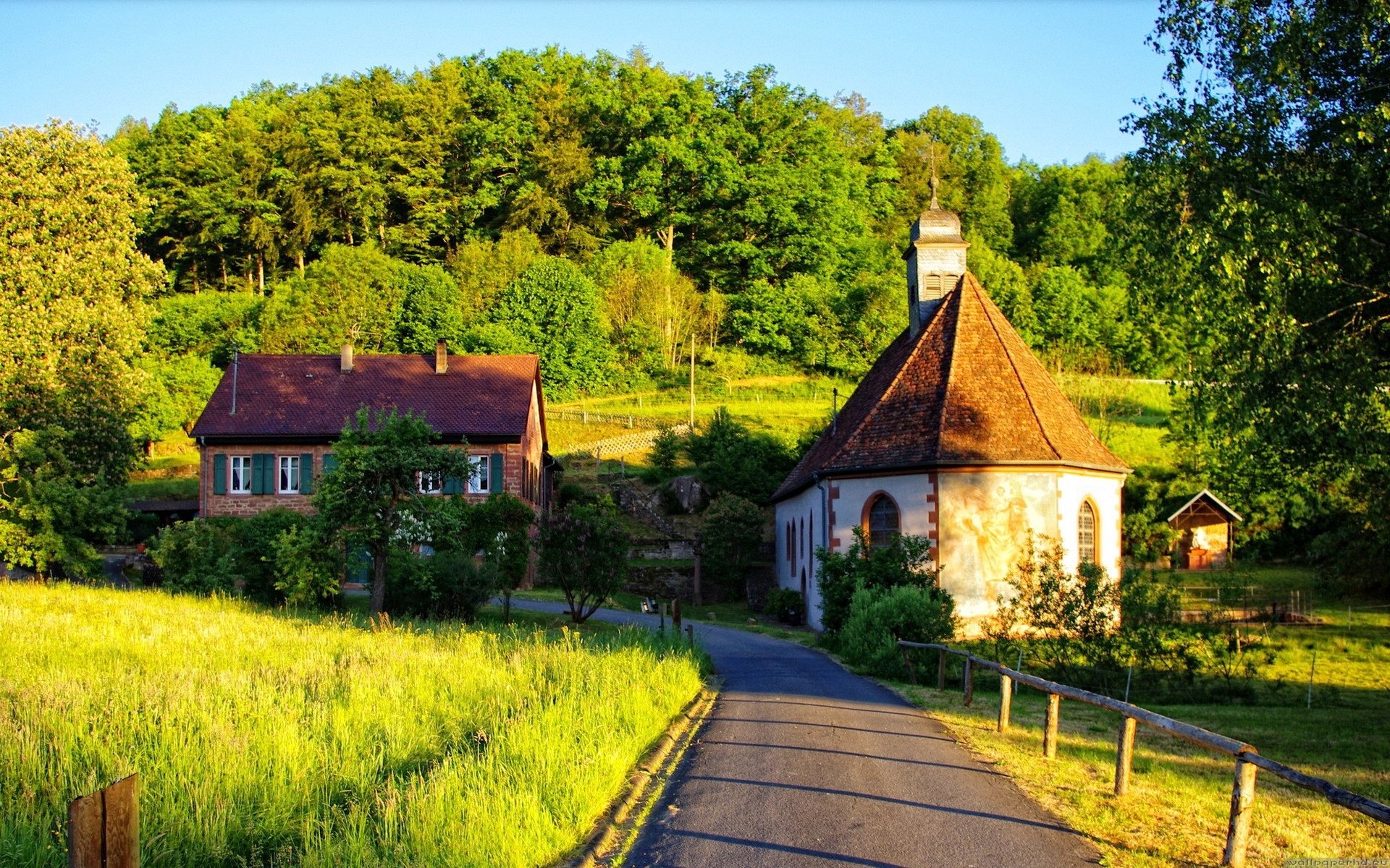 Description: A road that has a small house on it and a fence around it and a grassy field behind it.